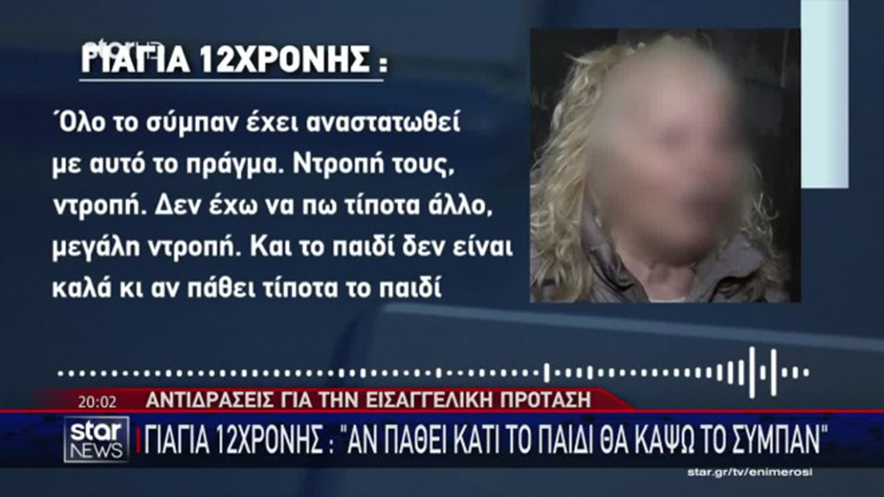«Όλο το σύμπαν έχει αναστατωθεί με αυτό το πράγμα. Ντροπή τους, ντροπή. Δεν έχω να πώ τίποτα άλλο, μεγάλη ντροπή. Και το παιδί δεν είναι καλά κι αν πάθει τίποτα το παιδί εγώ δεν ξέρω τι θα κάνω, θα κάψω το σύμπαν αν το παιδί πάθει κάτι με αυτά που βλέπει. Ντροπή τους, ντροπή τους. Είμαι εξοργισμένη» ξεσπά η γιαγιά της 12χρονης.