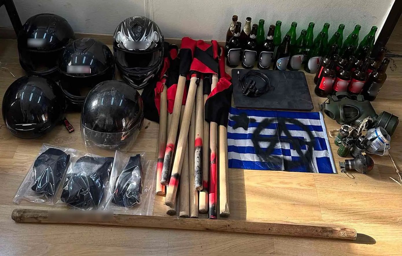 Οι αστυνομικές αρχές εντόπισαν ρόπαλα, μπουκάλια, κράνη, χειροβομβίδες κρότου λάμψης, χημικές χειροβομβίδες δακρυγόνου και καμένες ελληνικές σημαίες.