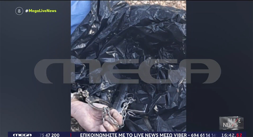Το πτώμα του 50χρονου άνδρα βρέθηκε τυλιγμένο σε σακούλες σκουπιδιών, πίσω από δέντρα για να μην φαίνεται από τον δρόμο. Στο ένα του χέρι βρέθηκε ένα όπλο περασμένο με αλυσίδα και από τον καρπό του άλλου χεριού κρέμονταν χειροπέδες.