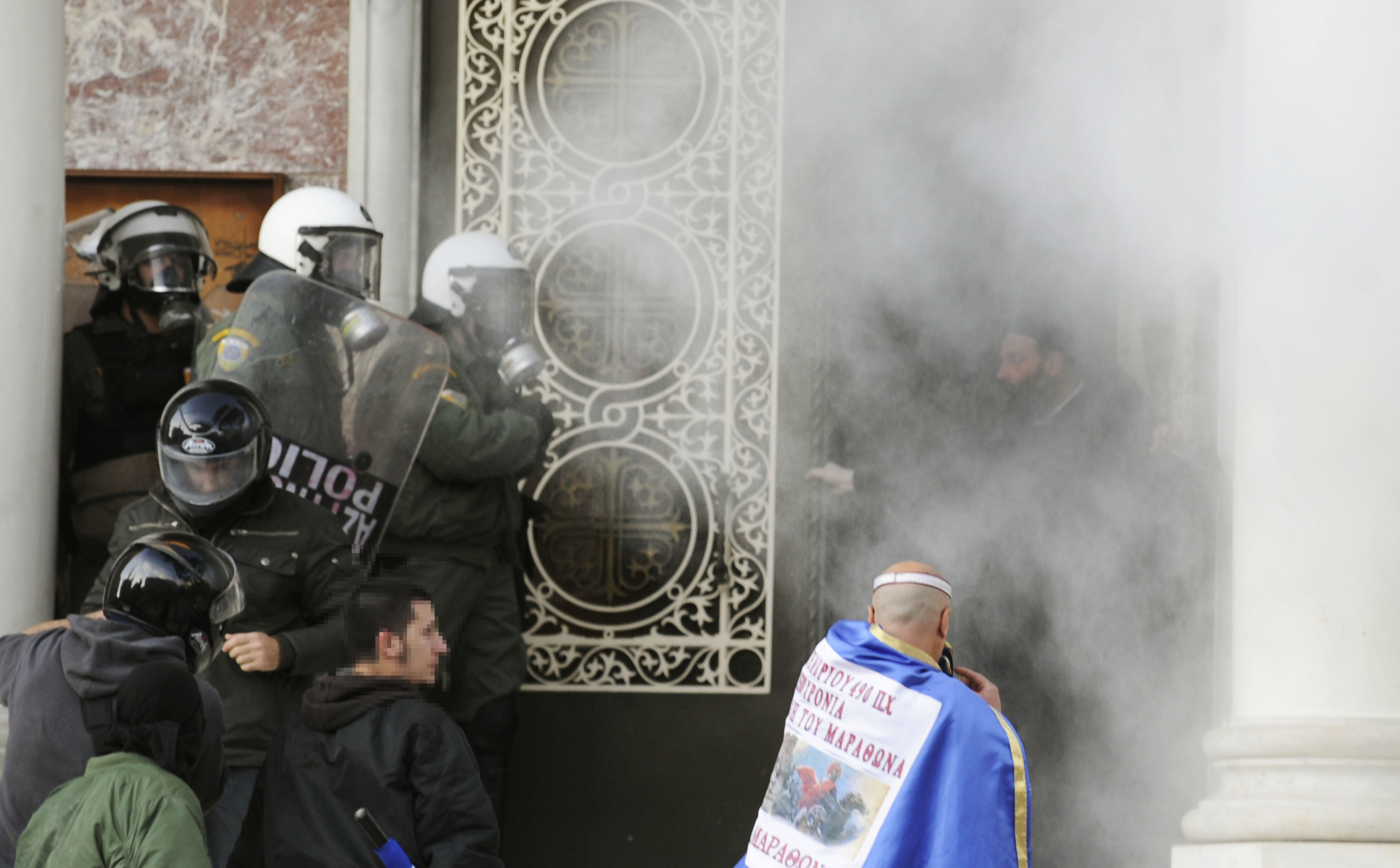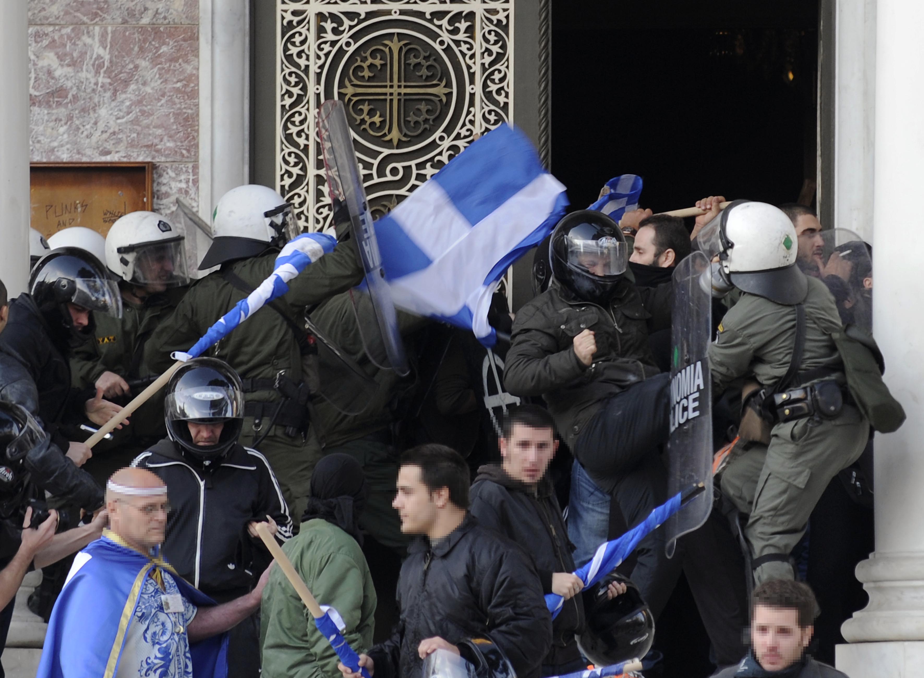 Τα άτομα που είχαν συγκεντρωθεί στην πλατεία από το πρωί, έφεραν διακριτικά της «Χρυσής Αυγής» και φώναζαν συνθήματα κατά των μεταναστών. Τη στιγμή που επιτέθηκαν στους αστυνομικούς, οι δυνάμεις της αστυνομίας έκαναν χρήση δακρυγόνων για να τους απωθήσουν και ο εισαγγελέας που ήταν παρών ζήτησε από τους επικεφαλής του αντιρατσιστικού συλλαλητηρίου να μην προχωρήσουν προς την πλατεία, όπου είχαν σκοπό να πραγματοποιήσουν συναυλία, για λόγους δημόσιας τάξης.