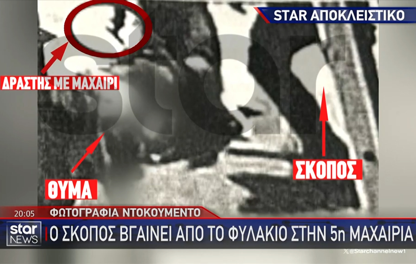 Στη φωτογραφία, που δημοσιεύει το Star, αποτυπώνεται ο φρουρός του αστυνομικού τμήματος να βγαίνει στην 5η και τελευταία μαχαιριά του δράστη στην Κυριακή Γρίβα.