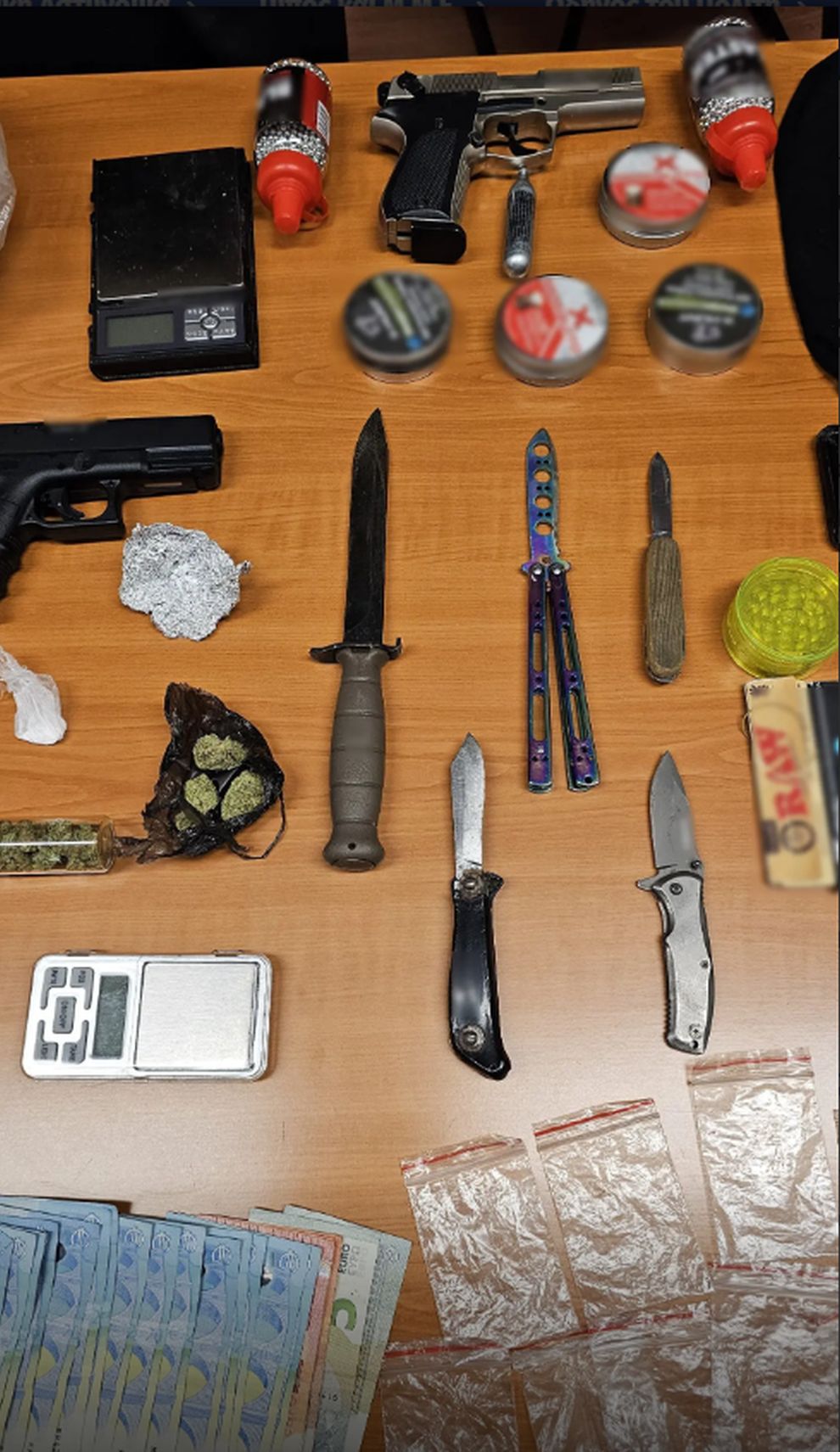 • 2 αεροβόλα πιστόλια με 7 μεταλλικές συσκευασίες που περιείχαν πλήθος σφαιριδίων,