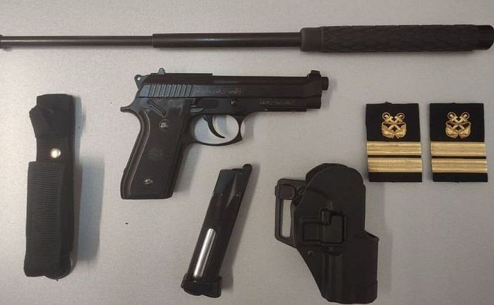 Εντός του σκάφους στο οποίο διέμενε, βρέθηκε μία πλαστική θήκη μέσης πιστολιού, ενώ διαπιστώθηκε ότι φορούσε μέσα από το σακάκι του, λευκό πουκάμισο με επωμίδες, στις οποίες έφερε τον βαθμό του Ανθυποπλοιάρχου Λιμενικού Σώματος.