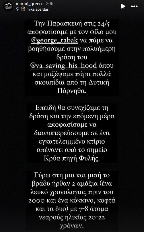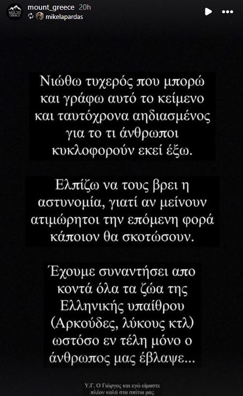 η ανάρτηση καταλήγει με τον εθελοντή να λέει «έχουμε συναντήσει από κοντά όλα τα ζώα της ελληνικής υπαίθρου (αρκούδες, λύκους κτλ) ωστόσο εν τέλει μόνο ο άνθρωπος μας έβλαψε».