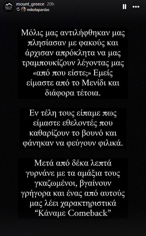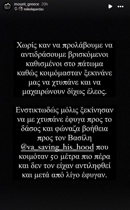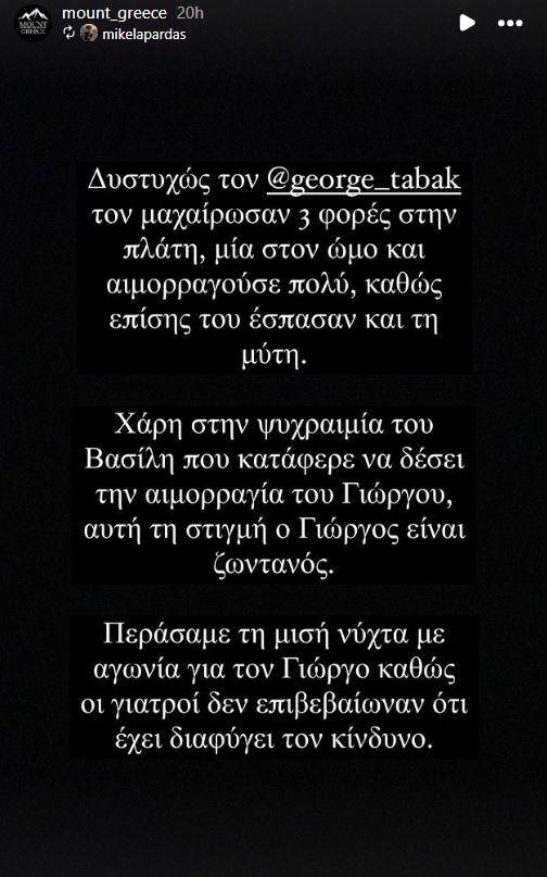 Ο αρχηγός της αποστολής, που έσωσε τον βαριά τραυματισμένο εθελοντή, ο οποίος αιμορραγούσε πολύ από την επίθεση με μαχαίρι στην Πάρνηθα, ανήρτησε story στο Instagram, δίπλα στους δύο φίλους του.