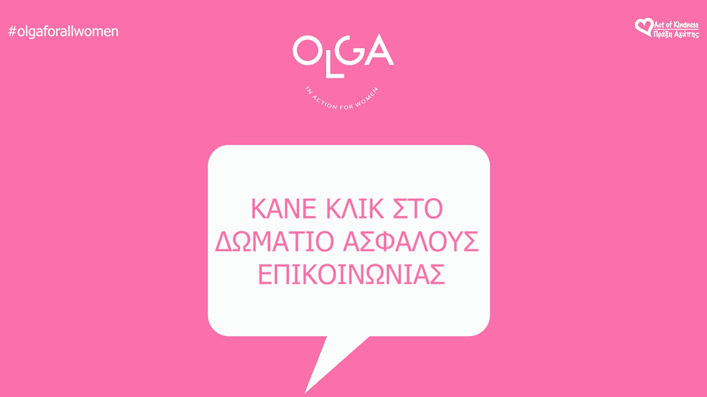 Ο οργανισμός «Πράξη Αγάπης», γνωστός για το κοινωνικό του έργο εδώ και 10 χρόνια, παρουσιάζει για πρώτη φορά στην Ελλάδα την ψηφιακή εφαρμογή OLGA (olgaforall.gr) μέσω της οποίας κάθε γυναίκα που υφίσταται βία μπορεί να στείλει ανώνυμα και δωρεάν γραπτό μήνυμα και να επικοινωνήσει σε πραγματικό χρόνο με εξειδικευμένο εκπρόσωπο, ο οποίος θα προσφέρει υπηρεσίες κοινωνικής, ψυχολογικής και συμβουλευτικής υποστήριξης.