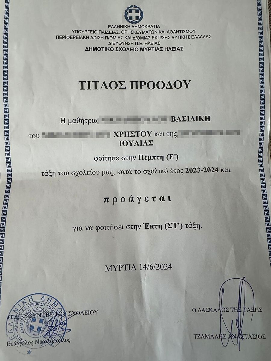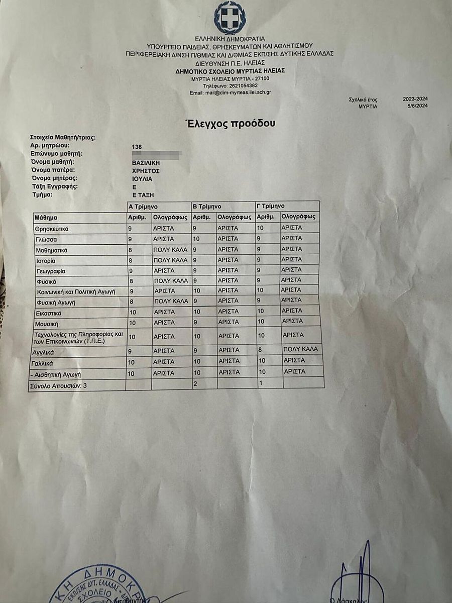 Το τοπικό site gnomip.gr δημοσιεύει το απολυτήριο της.