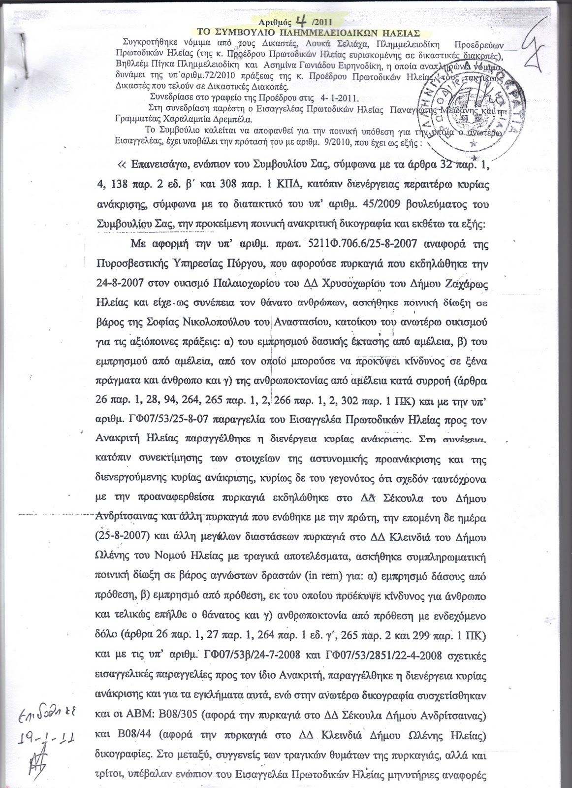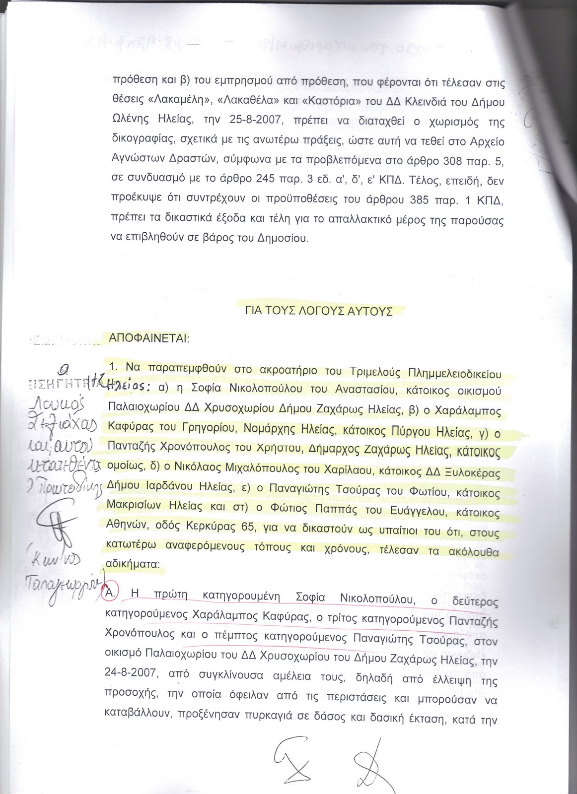 Το Συμβούλιο Πλημμελειοδικών Ηλείας με το υπ. Αριθμ. 4/2011 πολυσέλιδο Βούλευμά του που εκδόθηκε στις 14.1.2011, υιοθετώντας την πρόταση του εισαγγελέα Πλημμελειοδικών Ηλείας Παναγιώτη Μεϊδάνη , παραπέμπει στο ακροατήριο του Τριμελούς Πλημμελειοδικείου Ηλείας τους :