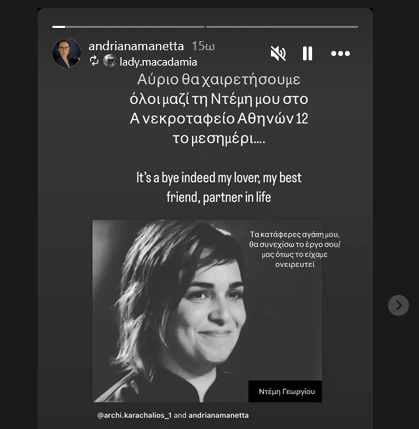 Η Μαριαλένα Ξηρομερίτη ανακοίνωσε μέσα από τον λογαριασμό της στο Instagram πως πήρε την απόφαση να συνεχίσει τη λειτουργία του εστιατορίου στην Πάρο, με τις συνταγές που έχει αφήσει η Ντέμη. «Αύριο θα χαιρετήσουμε όλοι μαζί τη Ντέμη μου στο Α’ Νεκροταφείο Αθηνών, στις 12 το μεσημέρι. Τα κατάφερες, αγάπη μου, θα συνεχίσω το έργο σου/μας, όπως το είχαμε ονειρευτεί», γράφει σε story της.