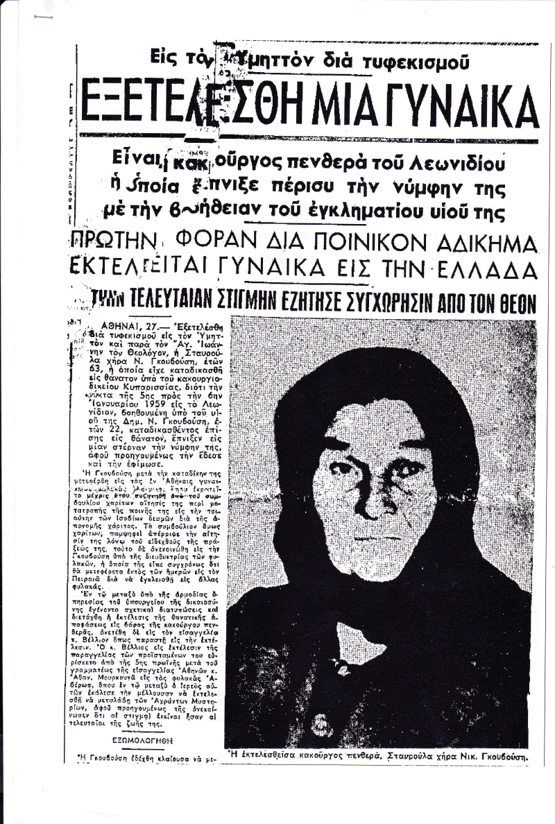 Σαν σήμερα το 1960 πραγματοποιείται η πρώτη εκτέλεση γυναίκας για ποινικό αδίκημα στην Ελλάδα. Η Σταυρούλα Γκουβούση εκτελείται, κατηγορούμενη για τη δολοφονία της 22χρονης εγκύου νύφης της, σε ένα από τα πιο σκοτεινά και σοκαριστικά εγκλήματα που έχουν καταγραφεί στα ελληνικά ποινικά χρονικά. Η ίδια δικαιολόγησε την πράξη της επειδή η νύφη της «δεν ήταν άγγελος αγνότητος».