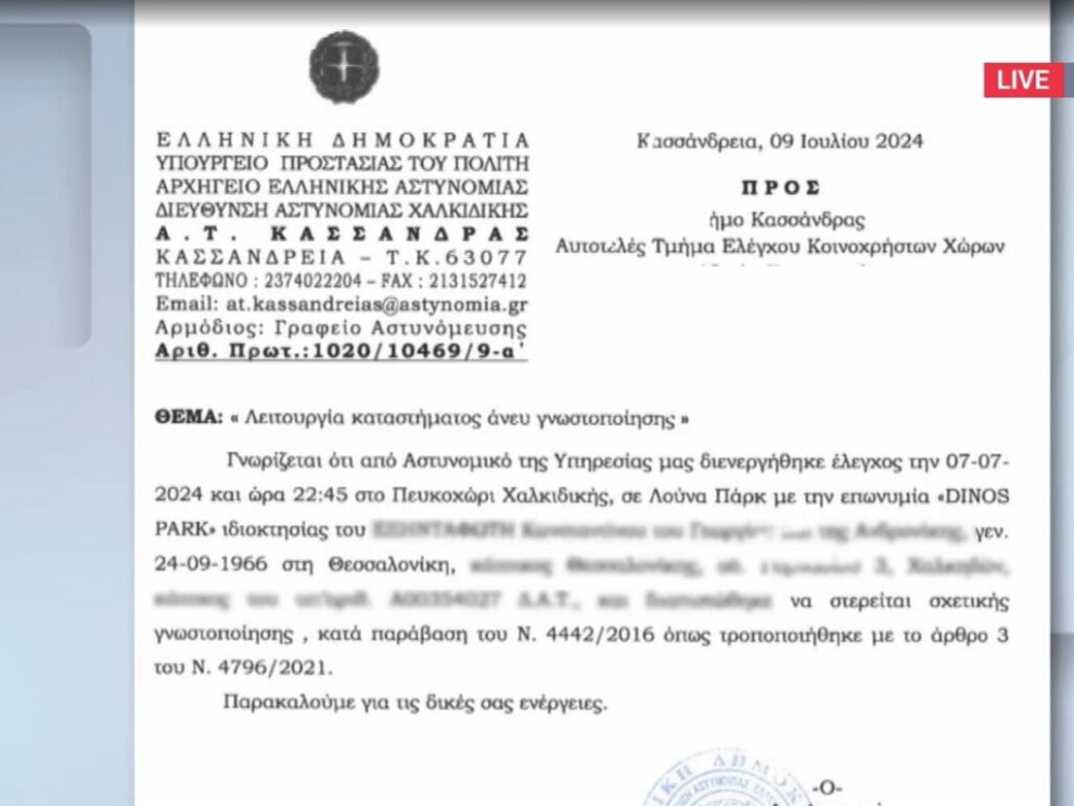 Στη δημοσιότητα δόθηκε ένα έγγραφο που προέρχεται από την Αστυνομία και αφορά το μοιραίο λούνα παρκ στη Χαλκιδική, καθώς η επιχείρηση δεν είχε γνωστοποιήσει τη λειτουργία της.