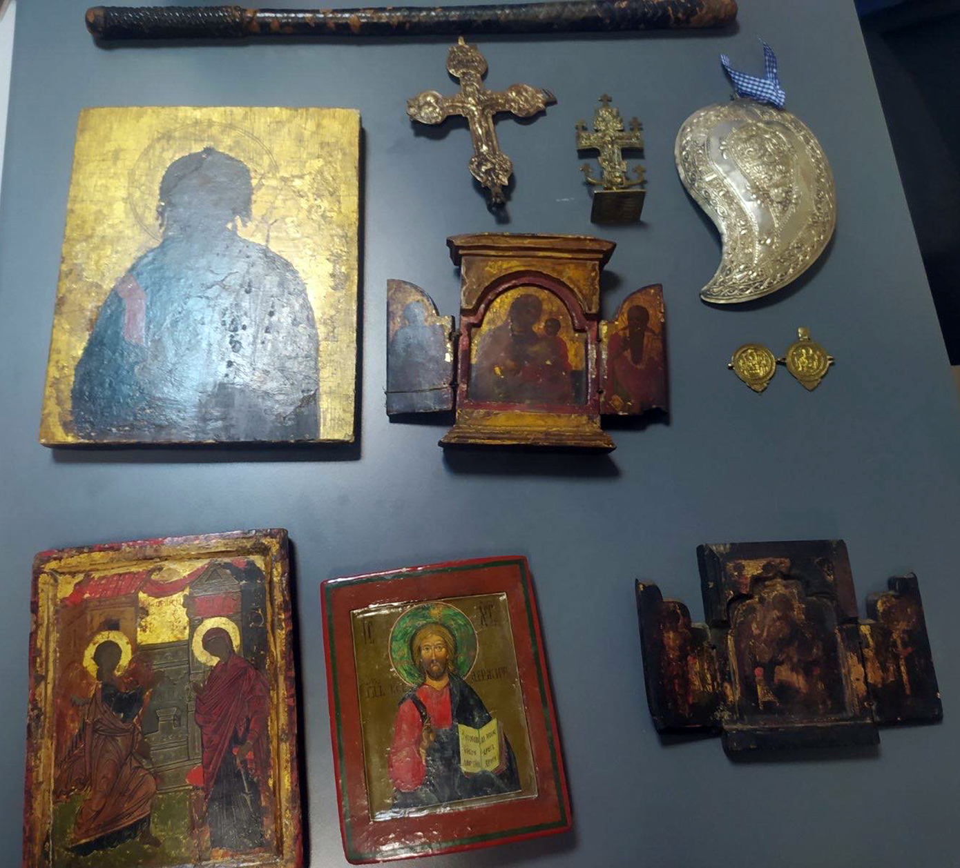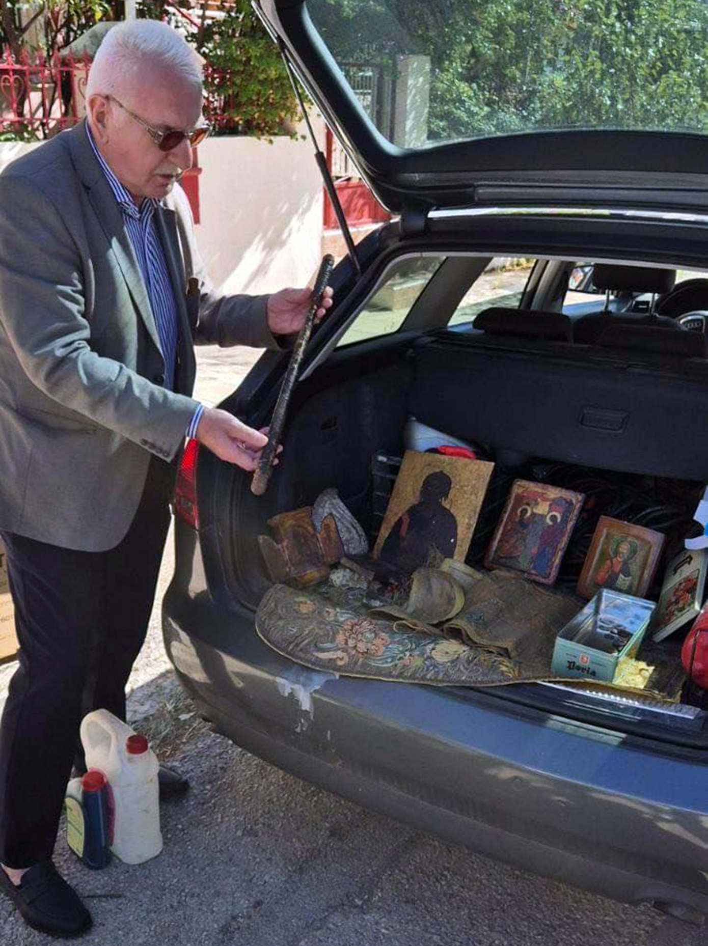 Ο 73χρονος ο οποίος είναι και συνταξιούχος κινηματογραφιστής κατείχε παρανόμως 48 ιερά κειμήλια, μεταξύ των οποίων ήταν ένα φαιλόνιο, ένα πετραχήλι, η ράβδος του βασιλέα Γεωργίου του Β, όπως επίσης πολλές βυζαντινές εικόνες και αρκετά νομίσματα.