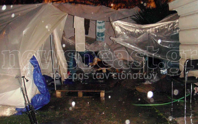 Όπου φτωχός κι η μοίρα του. Το μέγαρο Υπατία, όπου έχουν μεταφερθεί από την περασμένη Πέμπτη οι 237 μετανάστες, έχει πλημμυρίσει από την καταρρακτώδη βροχή που πέφτει τις τελευταίες ώρες στο λεκανοπέδιο.