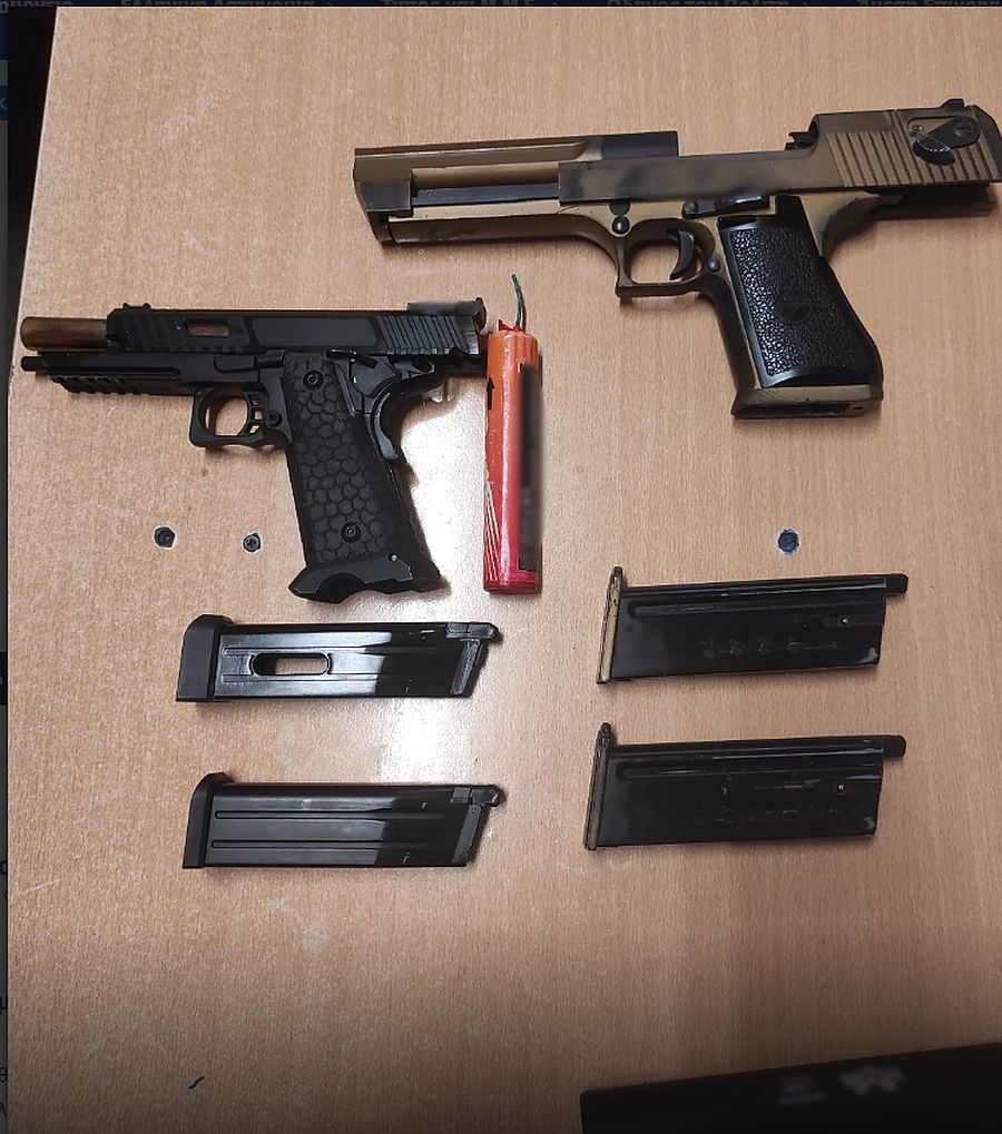 Μετά από έρευνα στο εσωτερικό του οχήματος βρέθηκαν κάτω από τη θέση του οδηγού -2- αεροβόλα πιστόλια, με τους γεμιστήρες τους, μην τηρώντας την κείμενη, για τη μεταφορά τους, νομοθεσία, καθώς και καπνογόνο και τρείς γεμιστήρες στο χώρο των αποσκευών, τα οποία κατασχέθηκαν.