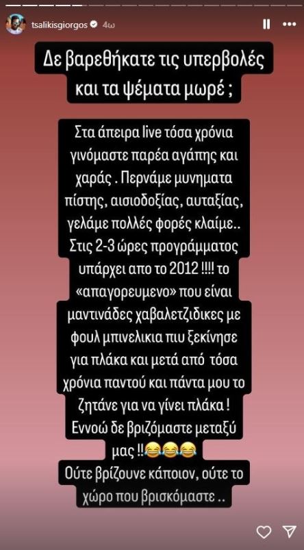 Απάντηση μετά τον σάλο που προκάλεσε η εκτέλεση του τραγουδιού του «Απαγορευμένο» στην έναρξη του «Μύλου των Ξωτικών» στα Τρίκαλα, μπροστά σε πολλά ανήλικα παιδιά, έδωσε ο Γιώργος Τσαλίκης μέσα από τα social media.