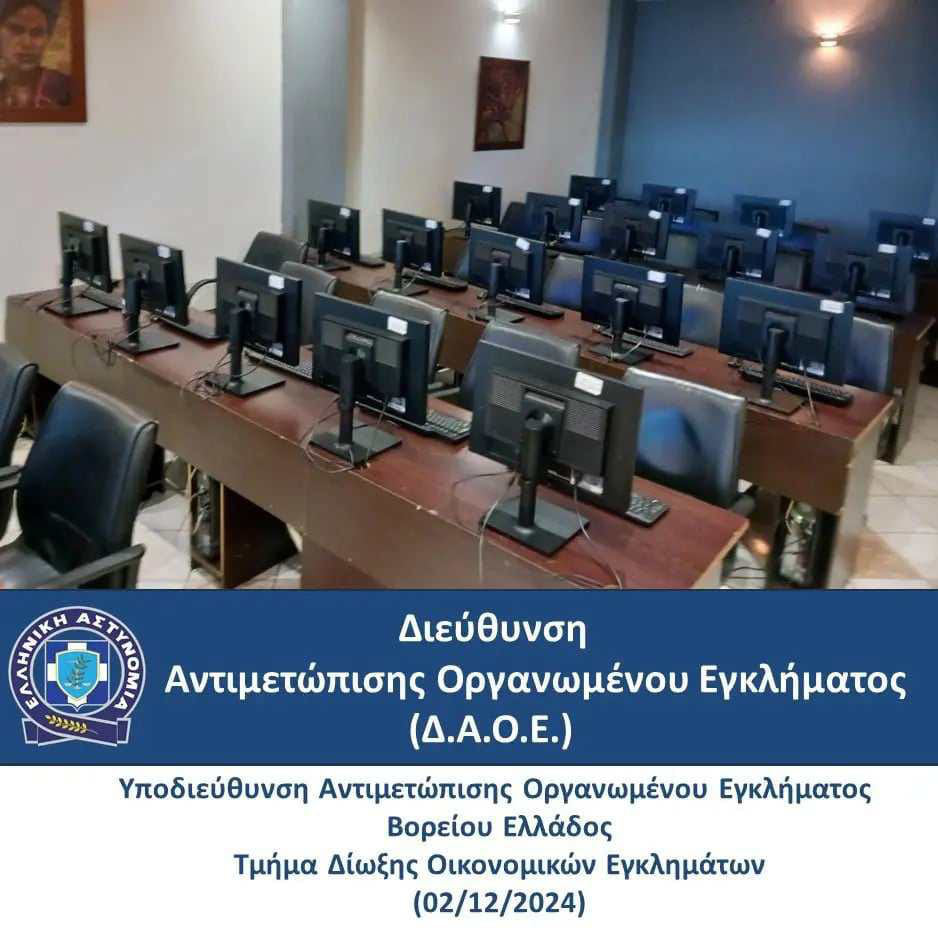 Σε έρευνες που πραγματοποιήθηκαν στους χώρους του καταστήματος, βρέθηκαν και κατασχέθηκαν, 23 ηλεκτρονικοί υπολογιστές σε δίκτυο, όπου στην οθόνη ενός απ’ αυτούς εμφανίζονταν φρουτάκια, καθώς και 1.530 ευρώ, από τα οποία τα 1.330 ευρώ ήταν επιμελώς κρυμμένα σε κλειδωμένο αποθηκευτικό χώρο του καταστήματος.