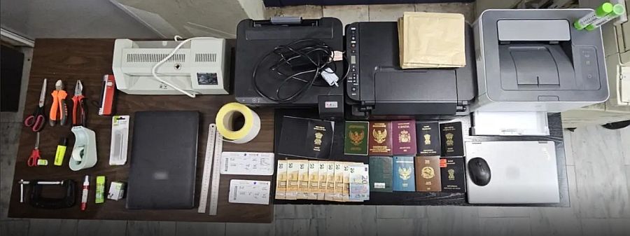 • εξοπλισμός κατάρτισης πλαστών εγγράφων (πλαστικοποιητής, 3 εκτυπωτές, σαρωτής, γραφική ύλη, φακός υπέρυθρου φωτός και ύφασμα εξωφύλλου διαβατηρίων)