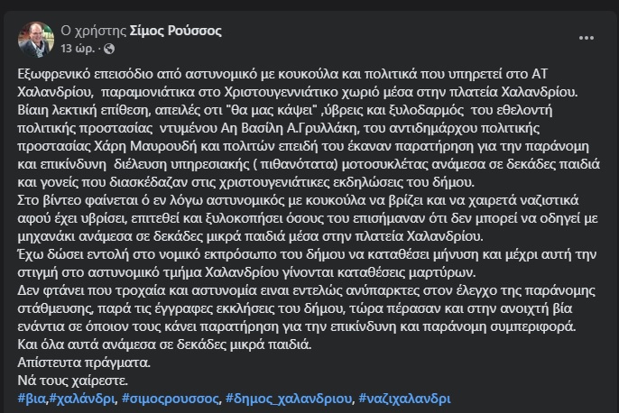 Σύμφωνα με την ανάρτηση του κ. Ρούσου, ο αστυνομικός που υπηρετεί στο ΑΤ Χαλανδρίου, με πολιτική περιβολή, πέρασε με τη μοτοσυκλέτα του μέσα από την πλατεία όπου έχει στηθεί το Χριστουγεννιάτικο χωριό την ώρα που στον χώρο κινούνταν μικρά παιδιά. Στις παρατηρήσεις των ανθρώπων των δήμου αλλά και πολιτών, ο αστυνομικός εξερράγη, εξαπολύοντας λεκτική επίθεση και απειλές στους παρευρισκόμενος ενώ μάλιστα χαιρέτησε και ναζιστικά.