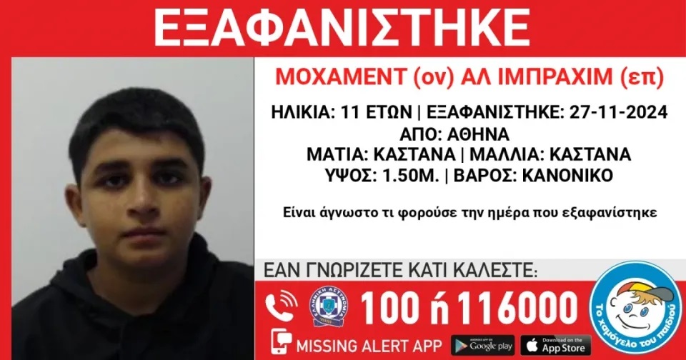Ένα 11χρονο αγόρι συριακής καταγωγής, ο Μοχάμεντ Αλ Ιμπραχίμ, παραμένει αγνοούμενο από τις 27 Νοεμβρίου, όταν εξαφανίστηκε από χώρο φιλοξενίας στην Αθήνα. Χθες, Τρίτη, 24 Δεκεμβρίου, το «Χαμόγελο του Παιδιού» ενημερώθηκε για την υπόθεση και προχώρησε στη δημοσιοποίηση των στοιχείων του, καθώς υπάρχουν ανησυχίες ότι η ζωή του μπορεί να βρίσκεται σε κίνδυνο.