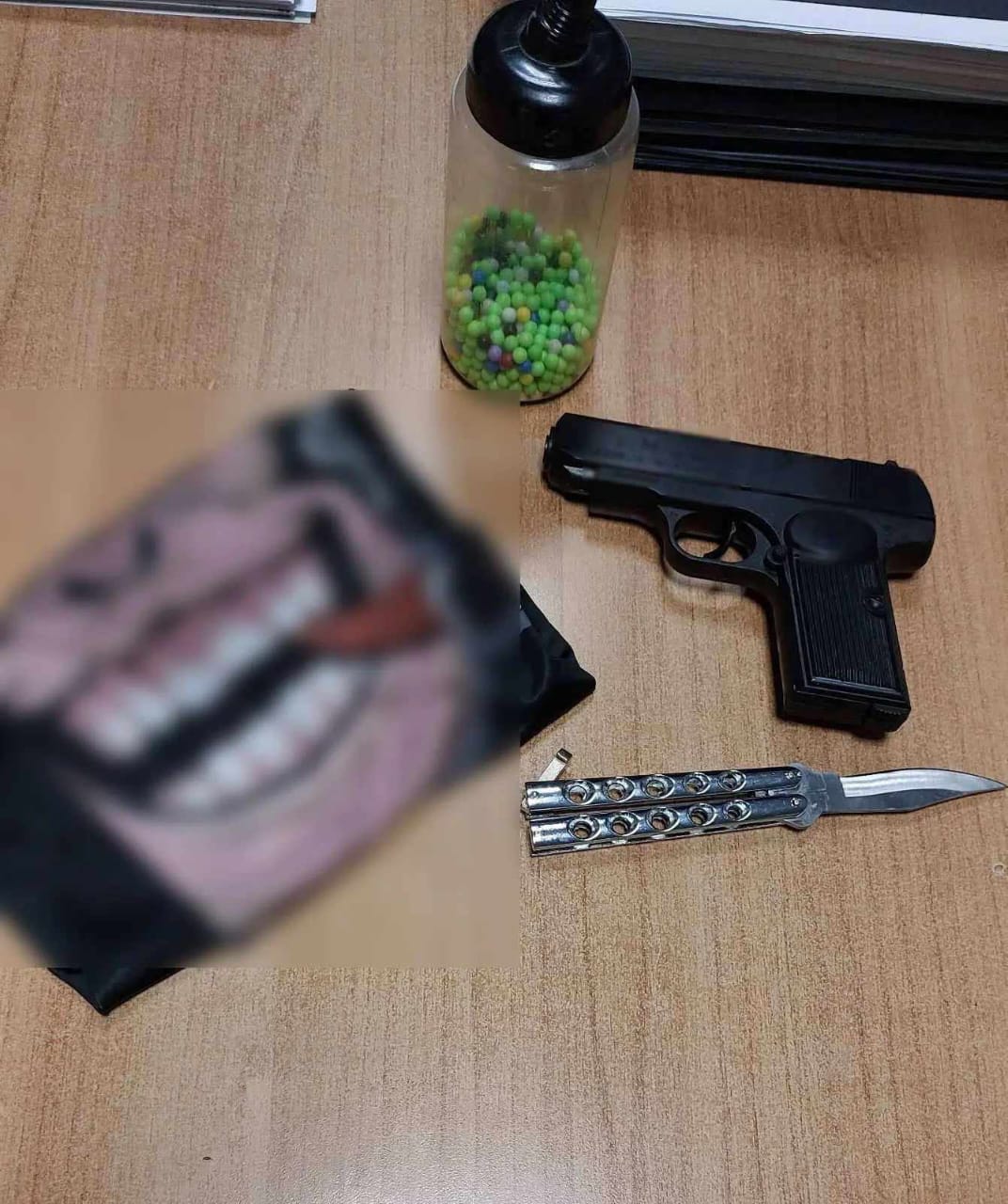 Επιπλέον, βρέθηκε να κατέχει ένα αεροβόλο πιστόλι τύπου ρεπλίκα, καθώς και ένα μπουκάλι με 410 σφαιρίδια για το συγκεκριμένο όπλο. Είχε επίσης μαζί του μια κουκούλα full face, γεγονός που εγείρει υποψίες για ενδεχόμενη εμπλοκή του σε συμμορία.