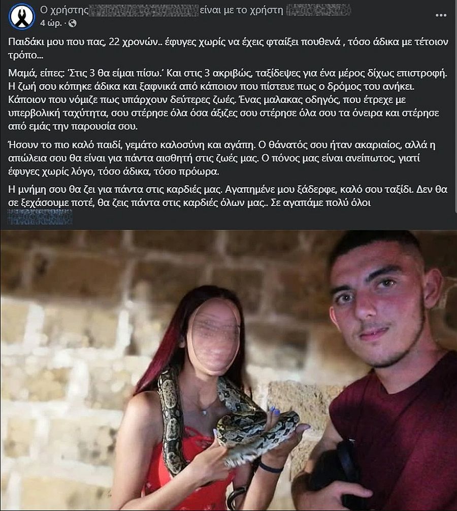 «Παιδάκι μου που πας, 22 χρονών.. έφυγες χωρίς να έχεις φταίξει πουθενά , τόσο άδικα με τέτοιον τρόπο… Μαμά, είπες: ‘Στις 3 θα είμαι πίσω.’ Και στις 3 ακριβώς, ταξίδεψες για ένα μέρος δίχως επιστροφή», αναφέρει μεταξύ άλλων η ξαδέρφη του θύματος.