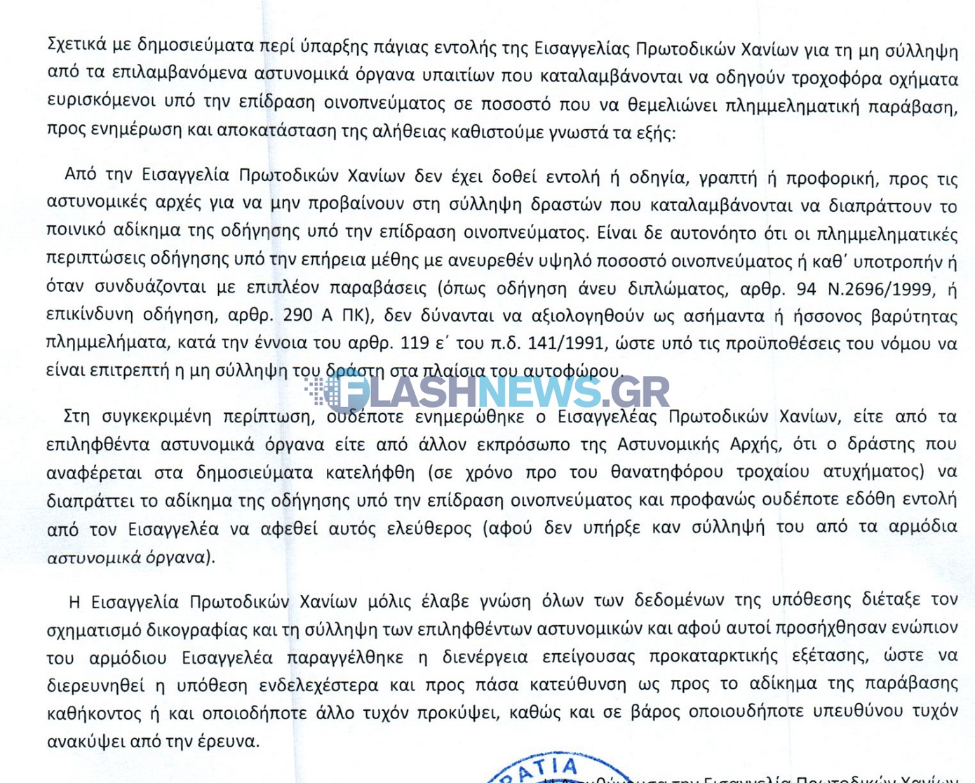 Στη συγκεκριμένη περίπτωση, όπως τονίζει η διευθύνουσα: «Ουδέποτε ενημερώθηκε ο Εισαγγελέας Πρωτοδικών Χανίων, είτε από τα επιληφθέντα αστυνομικά όργανα είτε από άλλον εκπρόσωπο της Αστυνομικής Αρχής, ότι ο δράστης που αναφέρεται στα δημοσιεύματα κατελήφθη (σε χρόνο προ του θανατηφόρου τροχαίου ατυχήματος) να διαπράττει το αδίκημα της οδήγησης υπό την επίδραση οινοπνεύματος και προφανώς ουδέποτε εδόθη εντολή από τον Εισαγγελέα να αφεθεί αυτός ελεύθερος (αφού δεν υπήρξε καν σύλληψή του από τα αρμόδια αστυνομικά όργανα)».