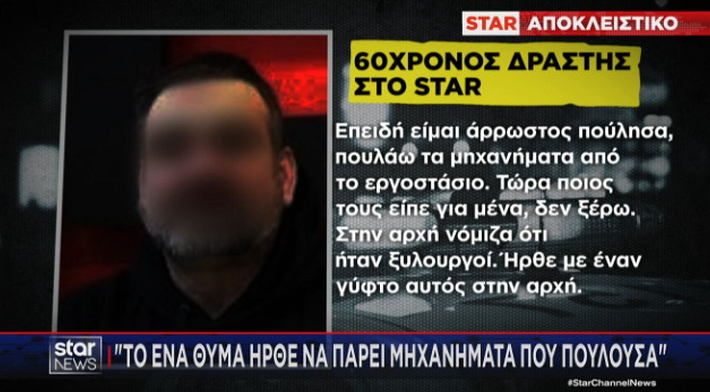 «Επειδή είμαι άρρωστος πούλησα, πουλάω τα μηχανήματα από το εργοστάσιο. Τώρα ποιος τους είπε για μένα, δεν ξέρω. Στην αρχή νόμιζα ότι ήταν ξυλουργοί. Ήρθε με ένα γύφτο αυτός στην αρχή.
