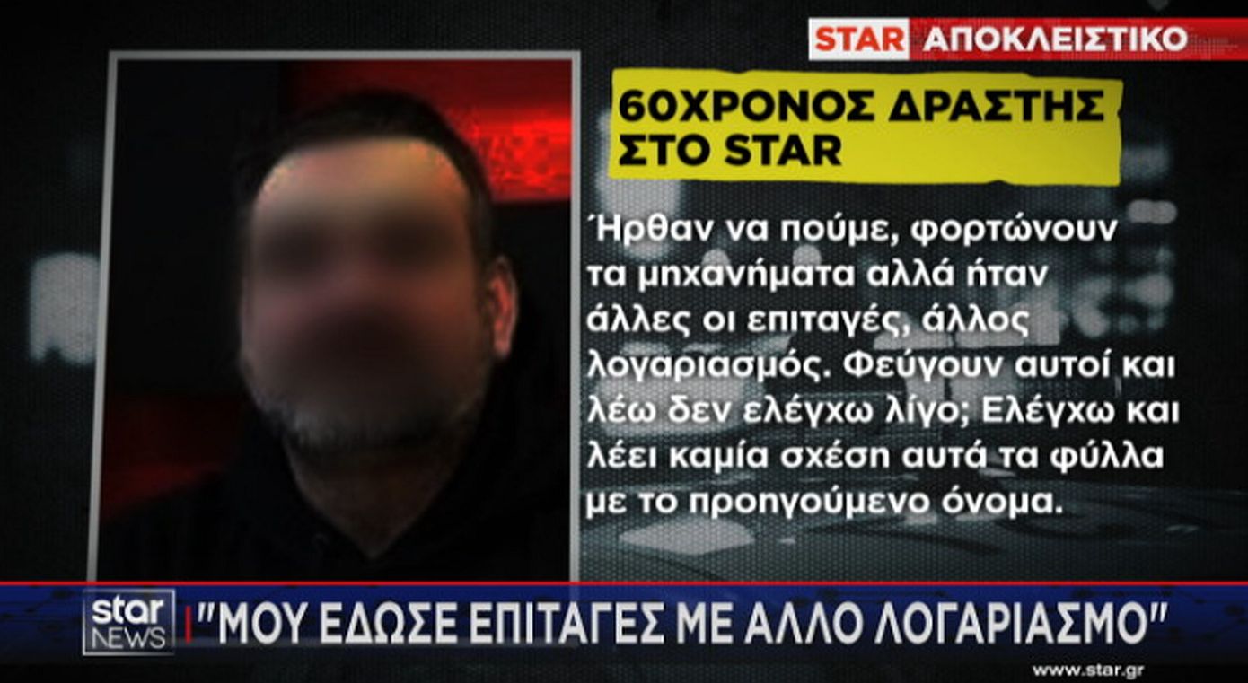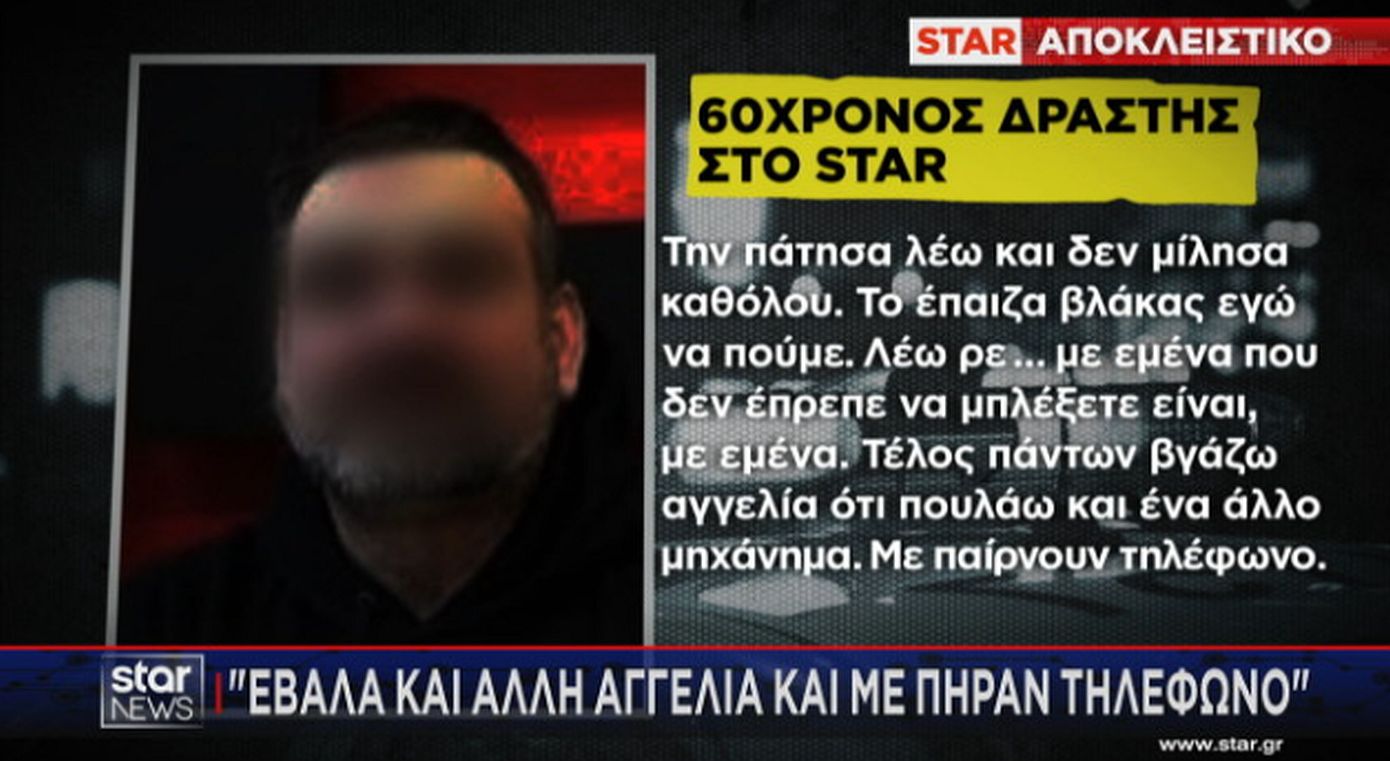 Γειά σου Μ….μπορούμε να ρθούμε; Ναι λέω, αυτή είναι η τιμή. Μου λέει αυτή τη φορά, λέει, θα στα βάλω χιλιάρια τα …Τελοσπάντων από τα 32 χιλιάρικα, πήρα τα δύο.Έτσι; Δύο χιλιάρικα. Και δεν μιλάω καθόλου το παίζω “Αλέκος”. Εγώ ξέρω την αγορά αυτοί οι σ…..αν σε ρίξουν, λεφτά από αυτούς δεν παίρνεις» είπε ο 60χρονος δράστης στο Star.