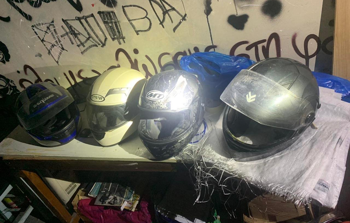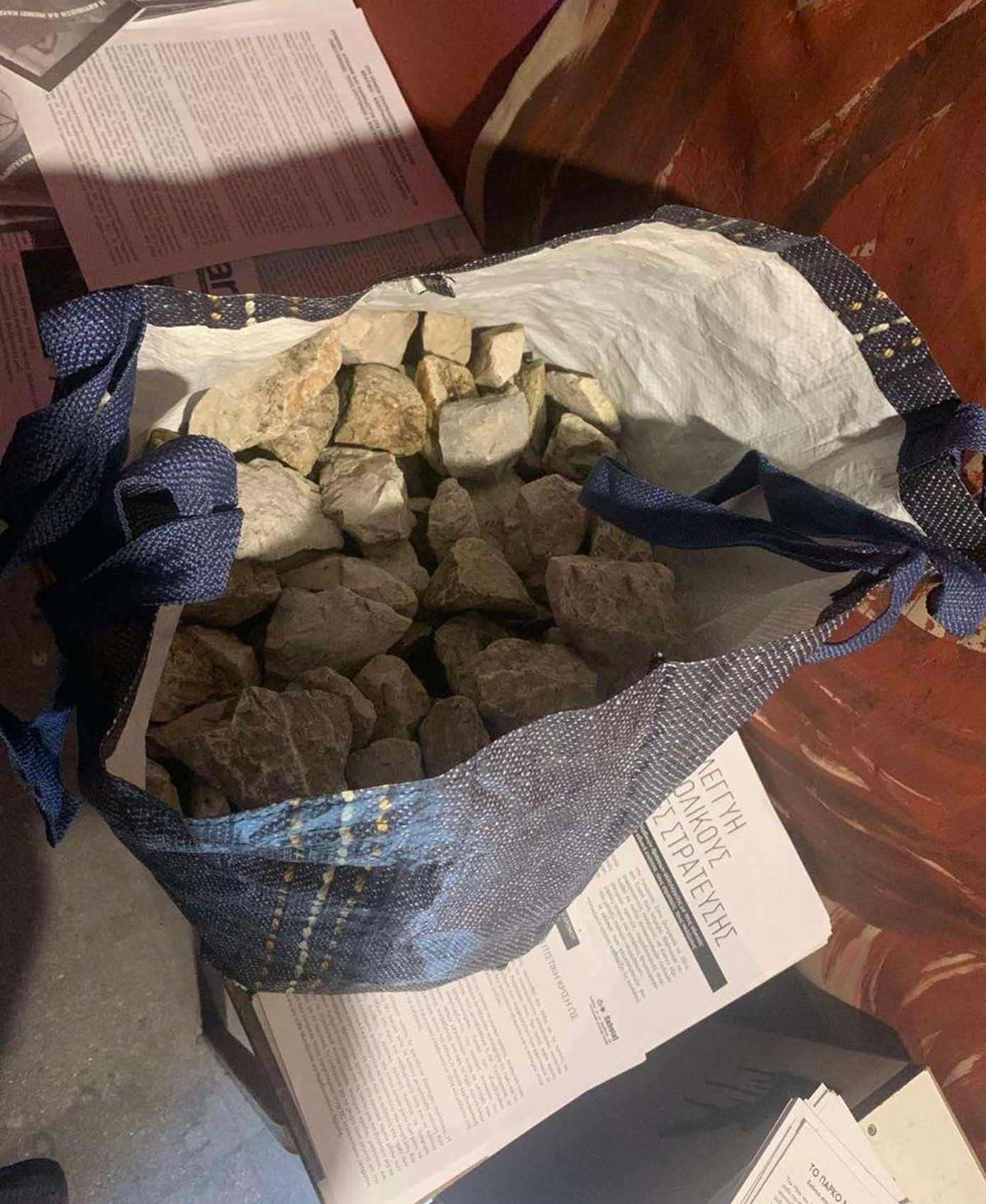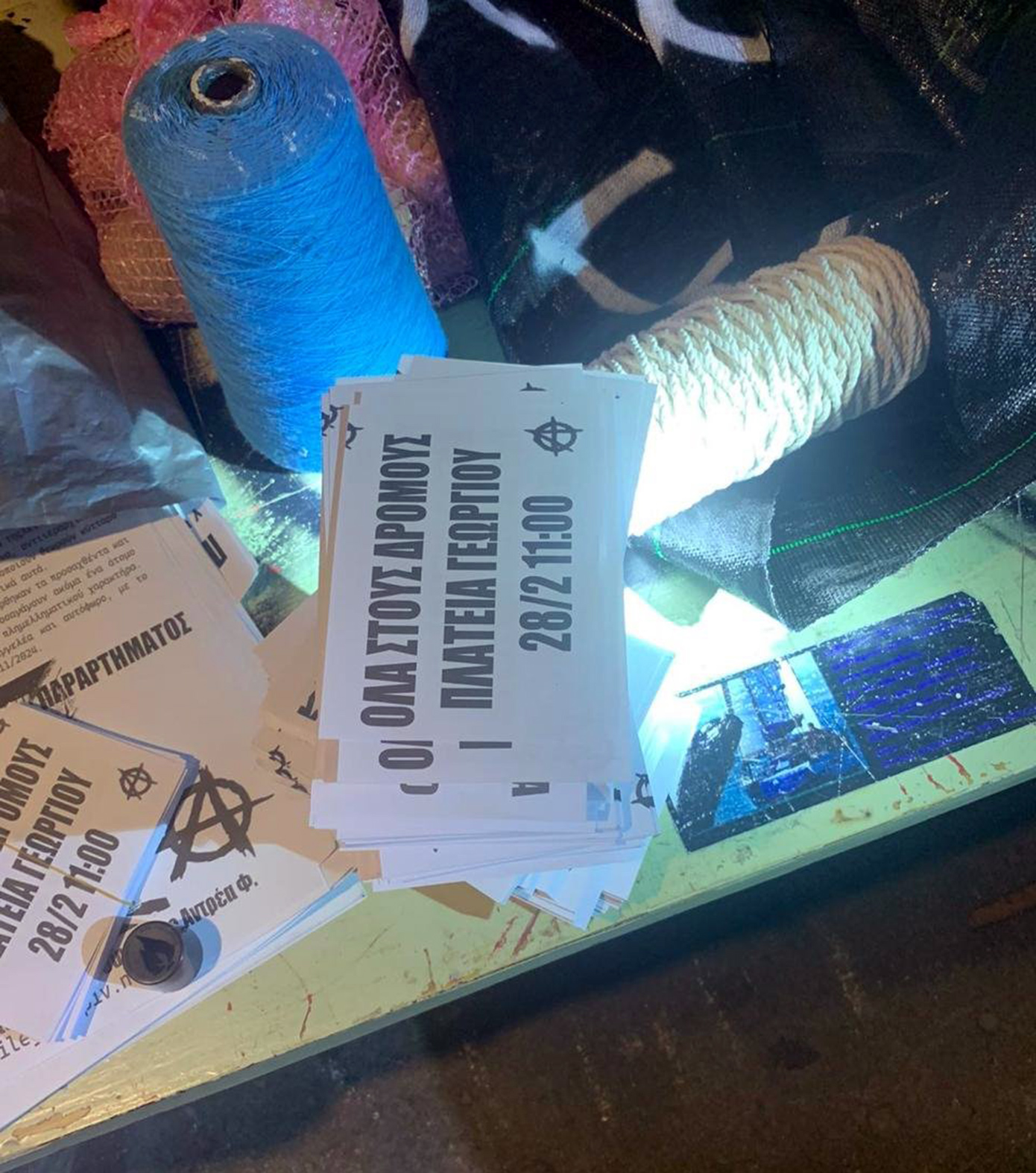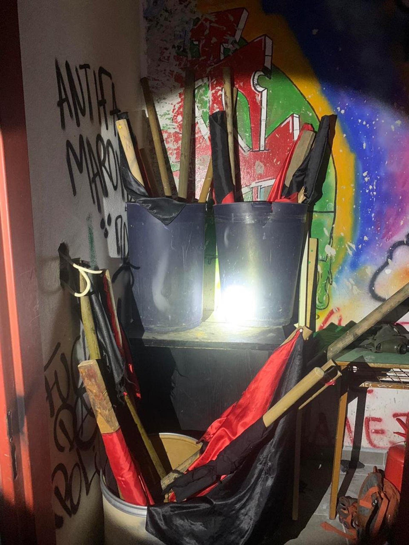 Κατά την έρευνα βρέθηκαν και κατασχέθηκαν 3 σακίδια με πέτρες και μάρμαρα, 11 πυροσβεστήρες, 11 αυτοσχέδιες ξύλινες ασπίδες, 33 ξύλινα κοντάρια, κράνη μοτοσικλέτας, πλαστικές καλαμίδες, σφεντόνα, αντιασφυξιογόνες μάσκες με προσαρμοσμένα φίλτρα, πλήθος σπρέι χρωμάτων, νάιλον σακούλα με σακουλάκια που περιείχαν μπογιά κόκκινου χρώματος και πλήθος μασκών μίας χρήσης.