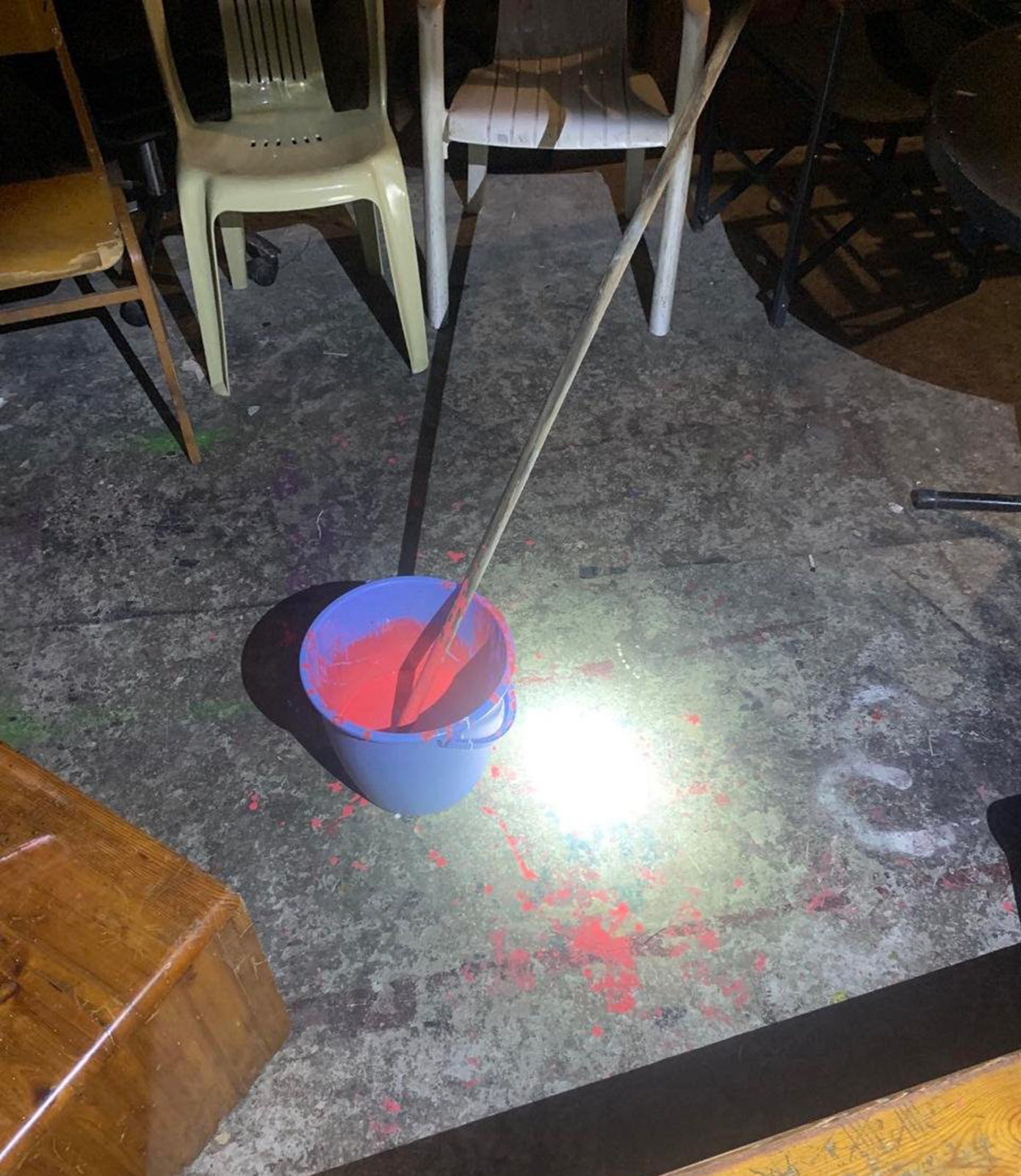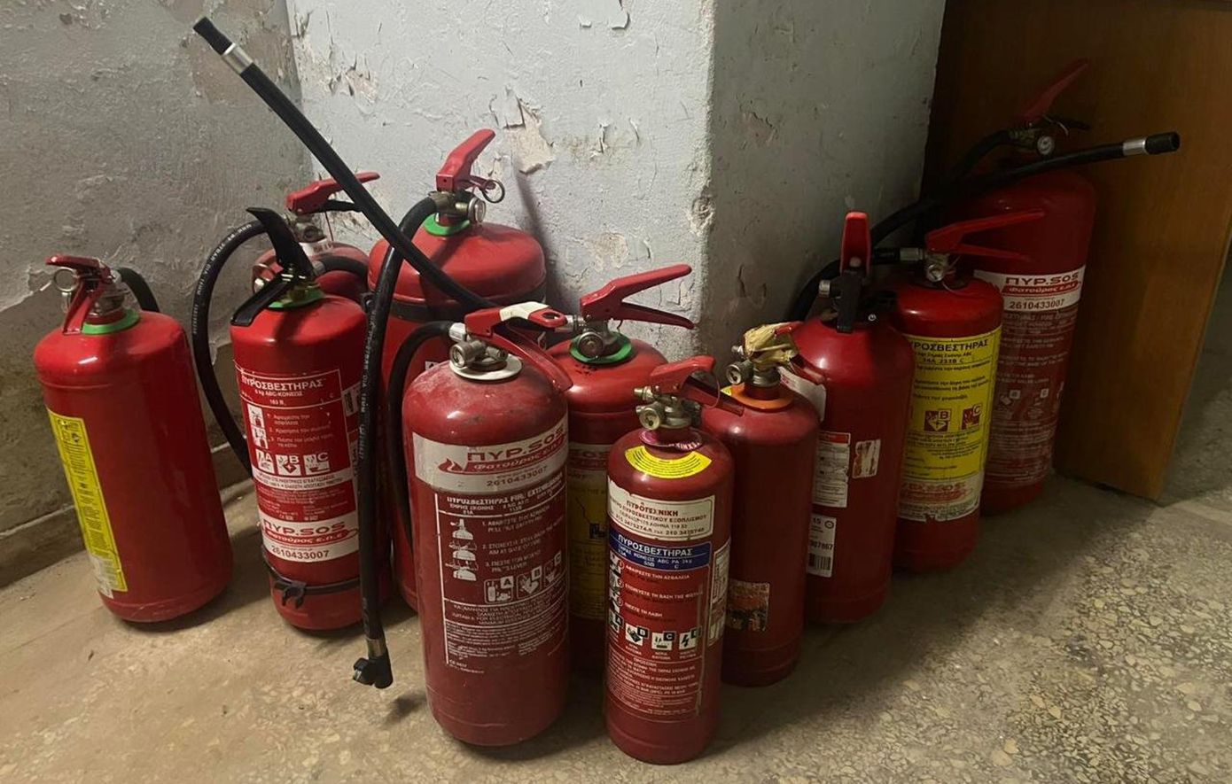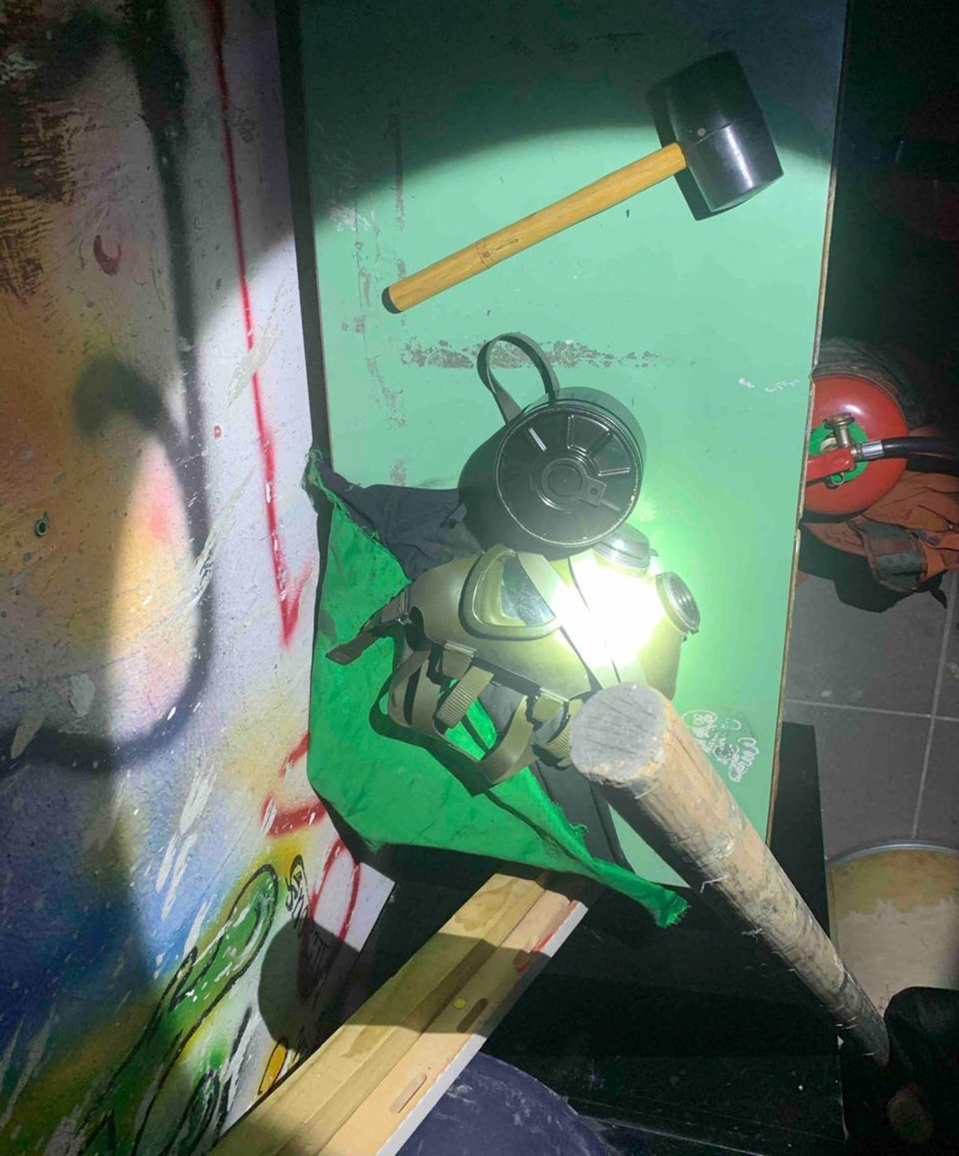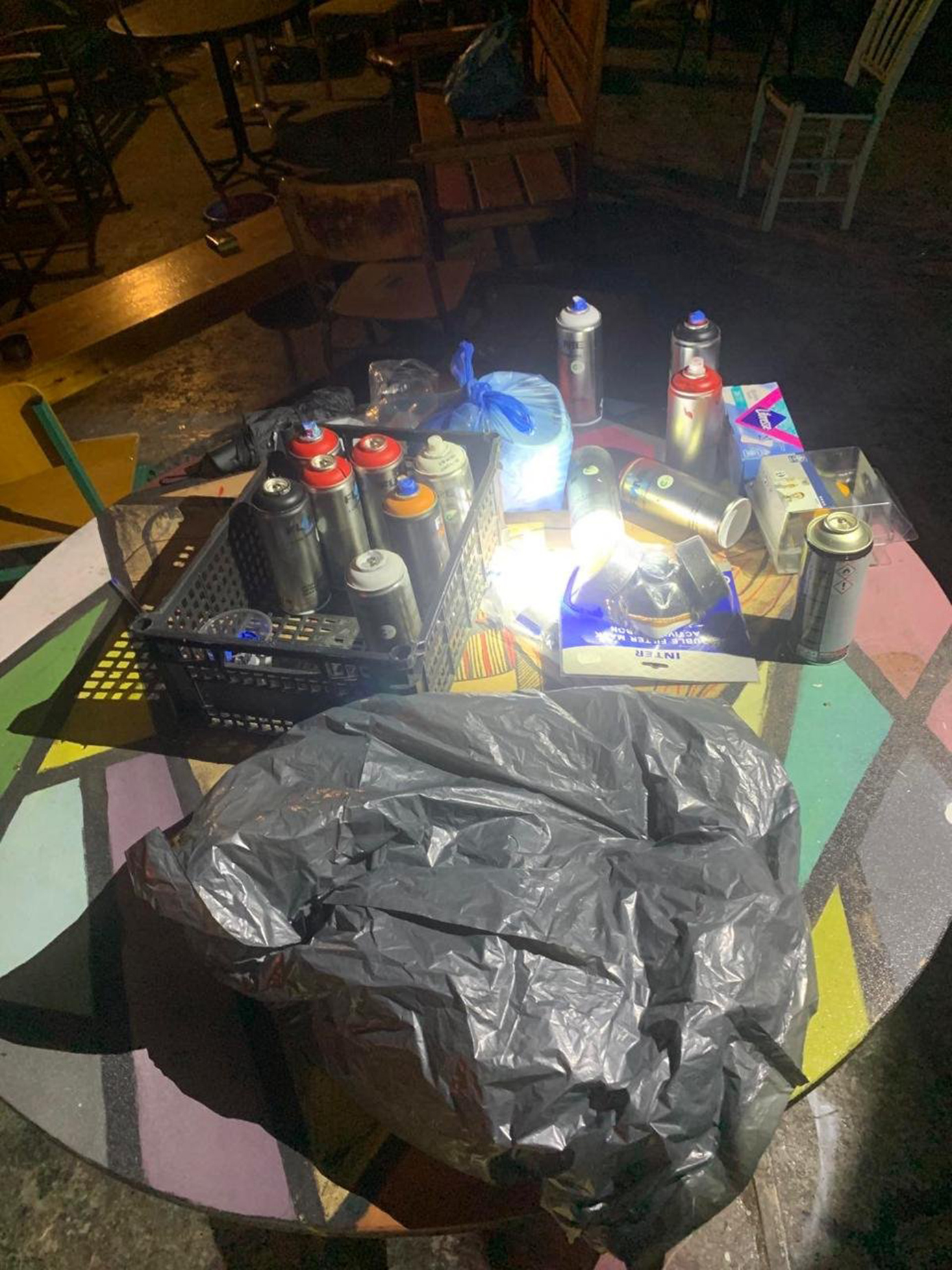 Κατά την έρευνα βρέθηκαν και κατασχέθηκαν 3 σακίδια με πέτρες και μάρμαρα, 11 πυροσβεστήρες, 11 αυτοσχέδιες ξύλινες ασπίδες, 33 ξύλινα κοντάρια, κράνη μοτοσικλέτας, πλαστικές καλαμίδες, σφεντόνα, αντιασφυξιογόνες μάσκες με προσαρμοσμένα φίλτρα, πλήθος σπρέι χρωμάτων, νάιλον σακούλα με σακουλάκια που περιείχαν μπογιά κόκκινου χρώματος και πλήθος μασκών μίας χρήσης.