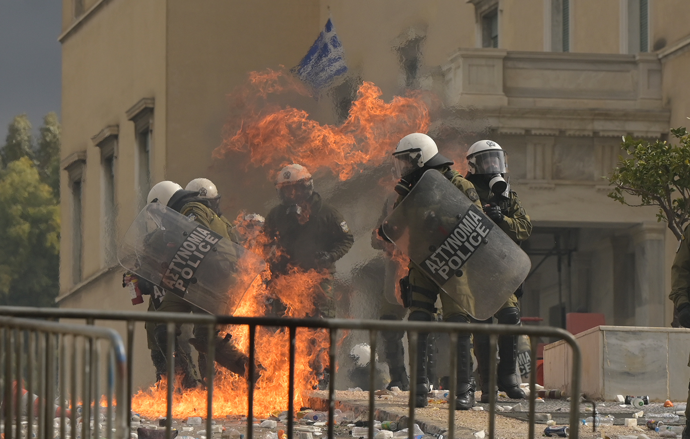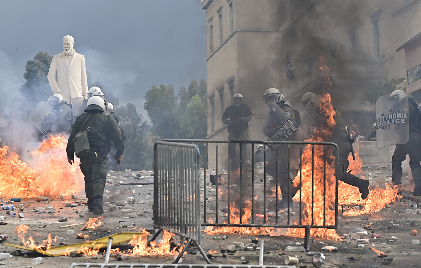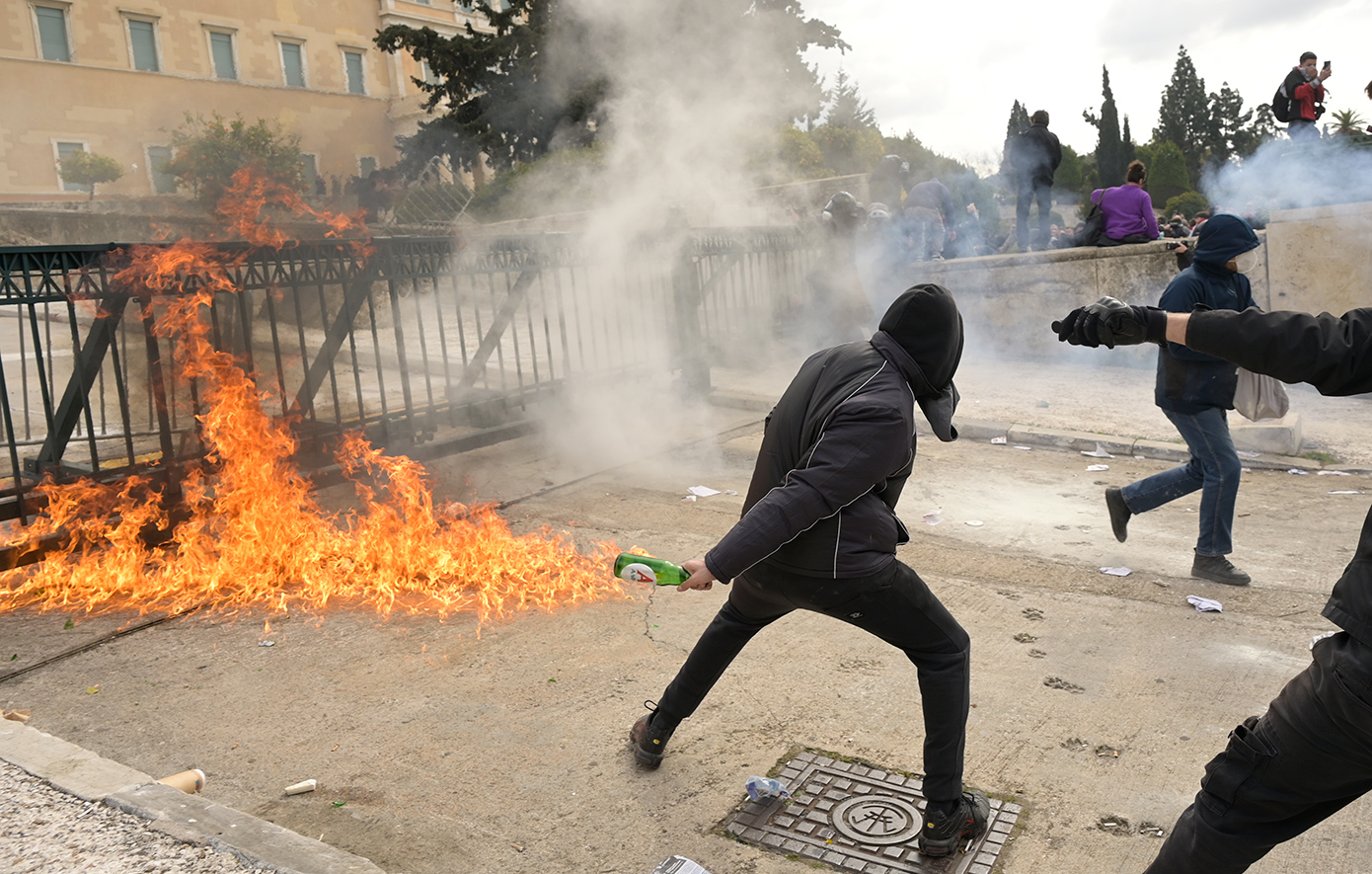 Άνδρες της Αστυνομίας προσπάθησαν να απομακρύνουν τους διαδηλωτές. Οι ομάδες των κουκουλοφόρων κινήθηκαν προς το προαύλιο της Βουλής και άρχισαν να πετούν βόμβες μολότοφ, με αποτέλεσμα να ξεσπάσει φωτιά στο κουβούκλιο του αξιωματικού αλλαγής στο Μνημείο του Αγνώστου Στρατιώτη.