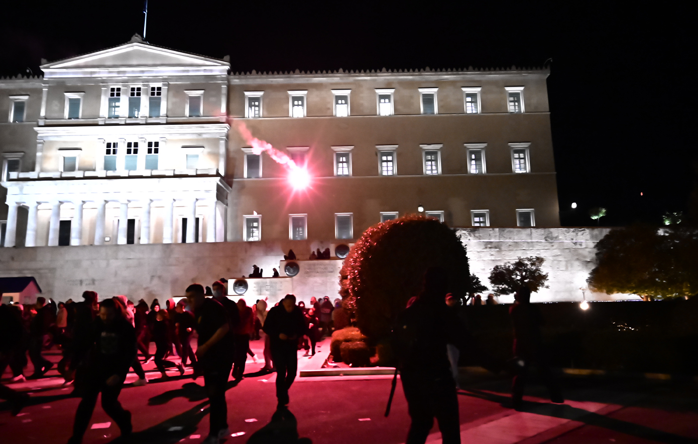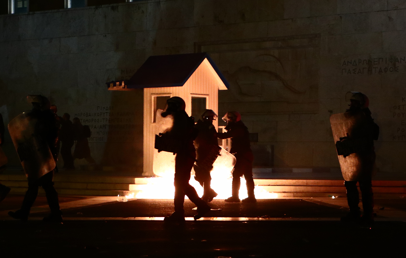 Τα επεισόδια ξέσπασαν περίπου στις 22:00 όταν ομάδα κουκουλοφόρων έριξε μολότοφ, πέτρες και άλλα αντικείμενα στις αστυνομικές δυνάμεις δίπλα από το άγαλμα του Αγνώστου Στρατιώτη. Οι αστυνομικοί απάντησαν κάνοντας χρήση χημικών, ενώ χρησιμοποιήθηκε και το υδροβόλο όχημα «Αίαντας».