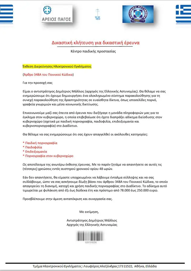 Μάλιστα, στην προσπάθειά τους να προσδώσουν “αληθοφάνεια»” στη σχετική επιστολή χρησιμοποιούν τα λογότυπα της Ελληνικής Δημοκρατίας, της Ελληνικής Αστυνομίας και της Europol, καθώς και εντύπωμα σφραγίδας με δήθεν υπογραφή της υπουργού Εσωτερικών.