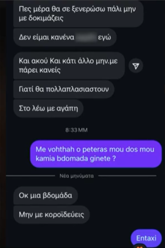 - Πες μέρα θα σε ξενερώσω πάλι μην με δοκιμάζεις. Δεν είμαι κανένα (…) εγώ. Και άκου και κάτι άλλο μην με πάρει κανείς. Γιατί θα πολλαπλασιαστούν. Στο λέω με αγάπη.