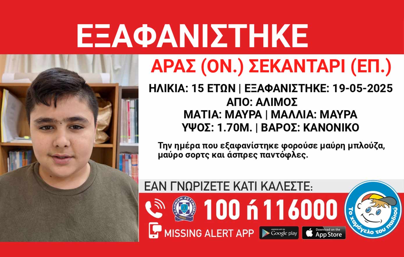 «Στις 19/05/2025, απογευματινές ώρες, εξαφανίστηκε από την περιοχή του Αλίμου ο Σεκαντάρι- Sekadary (επ.) Αράς- Arash (ον.), 15 ετών, Αφγανικής καταγωγής. Το “Χαμόγελο του Παιδιού” ενημερώθηκε σήμερα, 26/05/2025 για την εξαφάνισή του και προχώρησε άμεσα στη δημοσιοποίηση των στοιχείων του, κατοπιν εισαγγελικής εντολής, καθώς ενδέχεται να συντρέχουν λόγοι που θέτουν τη ζωή του σε κίνδυνο.