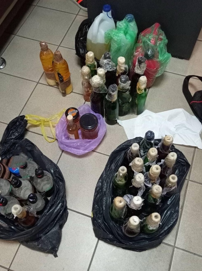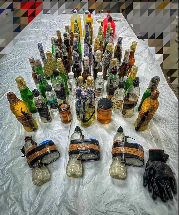 Σύμφωνα με την ίδια ανακοίνωση, συνολικά κατασχέθηκαν 49 ακέραιες αυτοσχέδιες εμπρηστικές – εκρηκτικές κατασκευές, δύο μπιτόνια κενά περιεχομένου με έντονη οσμή εύφλεκτου υλικού, μπιτόνι με εύφλεκτο υγρό, ιατρική μάσκα μιας χρήσης, τρία ζευγάρια γάντια, κατά περίπτωση, εργασίας και μιας χρήσης, πέντε σφουγγάρια, τρεις γυάλινες φιάλες κενές περιεχομένου, τέσσερις πλαστικές φιάλες που έφεραν την ένδειξη «βενζίνη» και πλήθος τεμαχίων υφάσματος (ρετάλια).