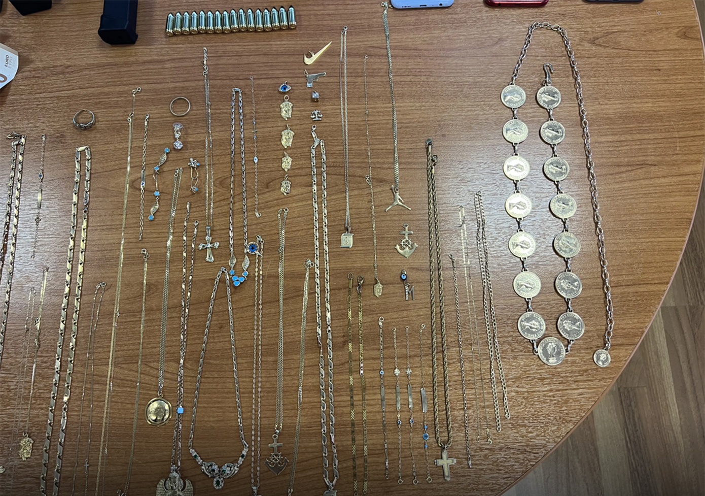 • 57 κοσμήματα χρυσού χρώματος (αλυσίδες και κολιέ με μενταγιόν, δαχτυλίδια, βέρες, σκουλαρίκια (σε ζεύγη), βραχιόλια)