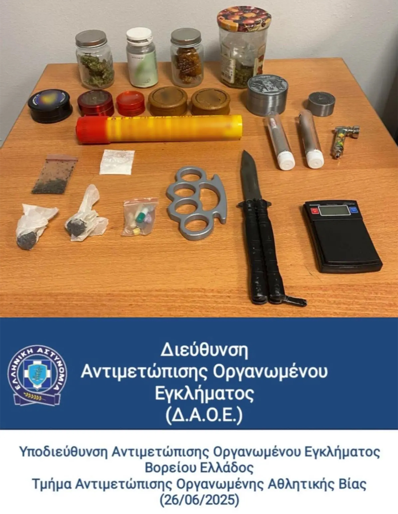 Συνολικά κατασχέθηκαν μικροποσότητες κατεργασμένης κάνναβης σε μορφή «σοκολάτας», ακατέργαστη κάνναβη, ναρκωτική ουσία (CHAGA και DMT CHAGA), ναρκωτικά χάπια (ecstasy, MDMA), δύο παραισθησιογόνα μανιτάρια, μία ηλεκτρονική ζυγαριά, μη ενεργοποιημένος ναυτικός πυρσός, σουγιάς, σιδερογροθιά κ.ά.