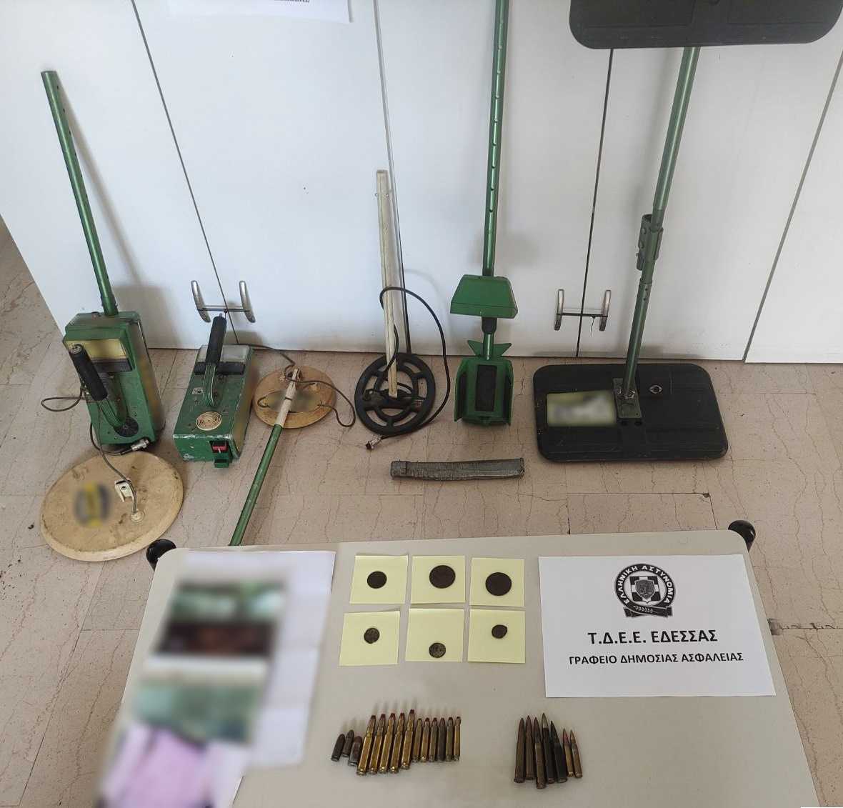 Ειδικότερα βρέθηκαν -μεταξύ άλλων- και κατασχέθηκαν 6 νομίσματα διαφόρων ιστορικών περιόδων, 21 φυσίγγια, εκ των οποίων τα 11 αβολίδωτα, 3 ανιχνευτές μετάλλων, 4 μεταλλικές ράβδοι εδάφους και 1 πολλαπλασιαστής βάθους.