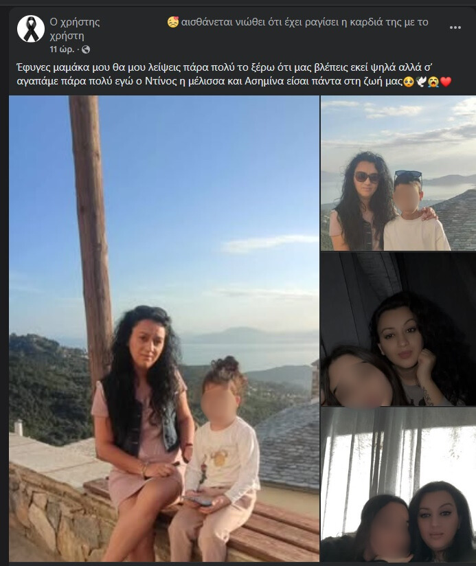 «Έφυγες μαμάκα μου, θα μου λείψεις πάρα πολύ. Το ξέρω ότι μας βλέπεις εκεί ψηλά αλλά σ’ αγαπάμε πάρα πολύ, εγώ, ο Ντίνος, η Μέλισσα και η Ασημίνα. Είσαι πάντα στη ζωή μας», έγραψε η κόρη της γυναίκας, συνοδεύοντας την ανάρτηση με φωτογραφίες των παιδιών μαζί με την αδικοχαμένη μητέρα τους.