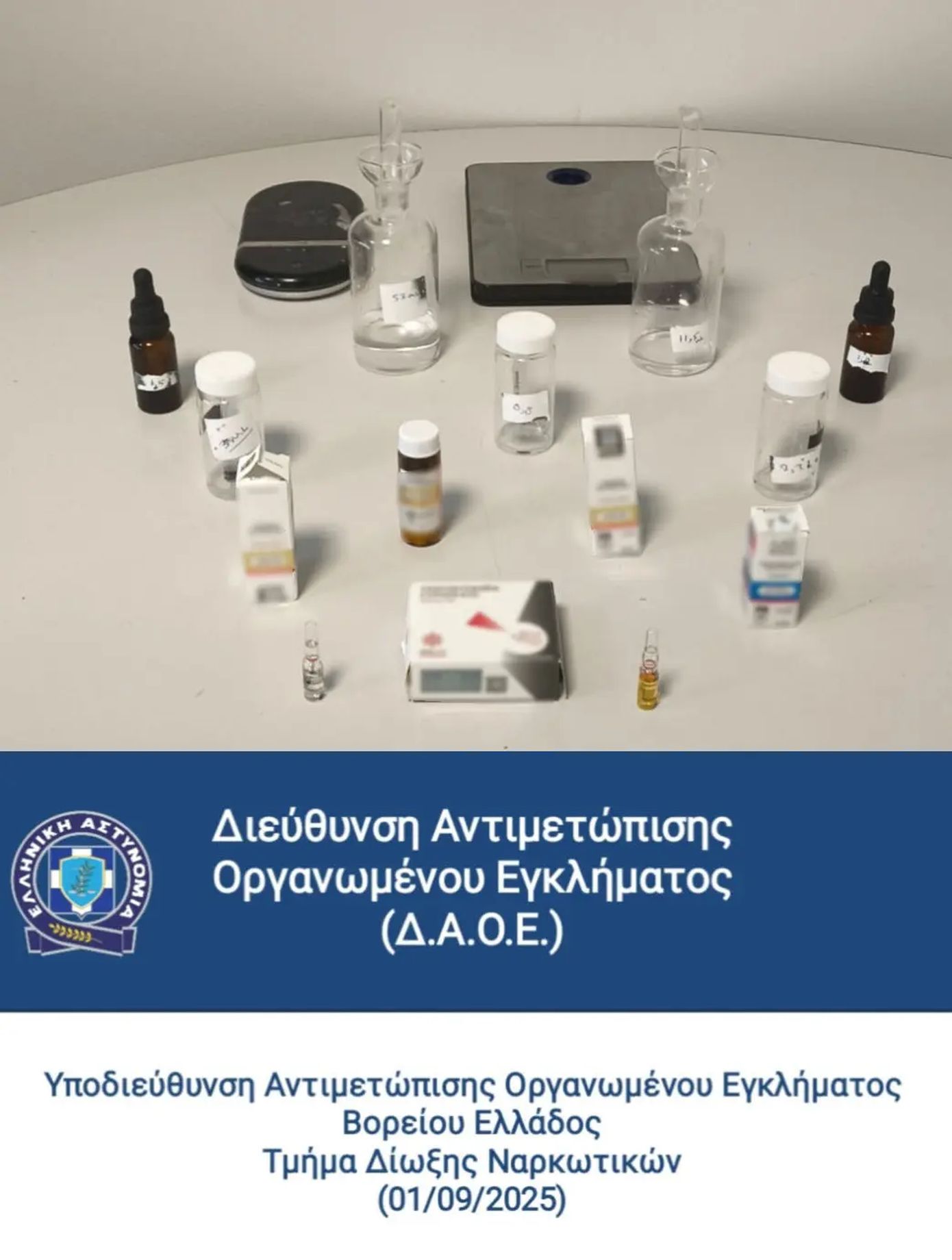 Σε αστυνομική έρευνα που πραγματοποιήθηκε σε σπίτι βρέθηκαν και κατασχέθηκαν επτά γυάλινα φιαλίδια που περιείχαν GHB καθαρής ποσότητας 73,3 ml, δύο σύριγγες των 2,5 ml με υπολείμματα της συγκεκριμένης ουσίας, 243 δισκία και πέντε αμπούλες αναβολικών, καθώς και δύο ηλεκτρονικές ζυγαριές ακριβείας, όπως αναφέρεται σε ανακοίνωση της ΕΛ.ΑΣ.