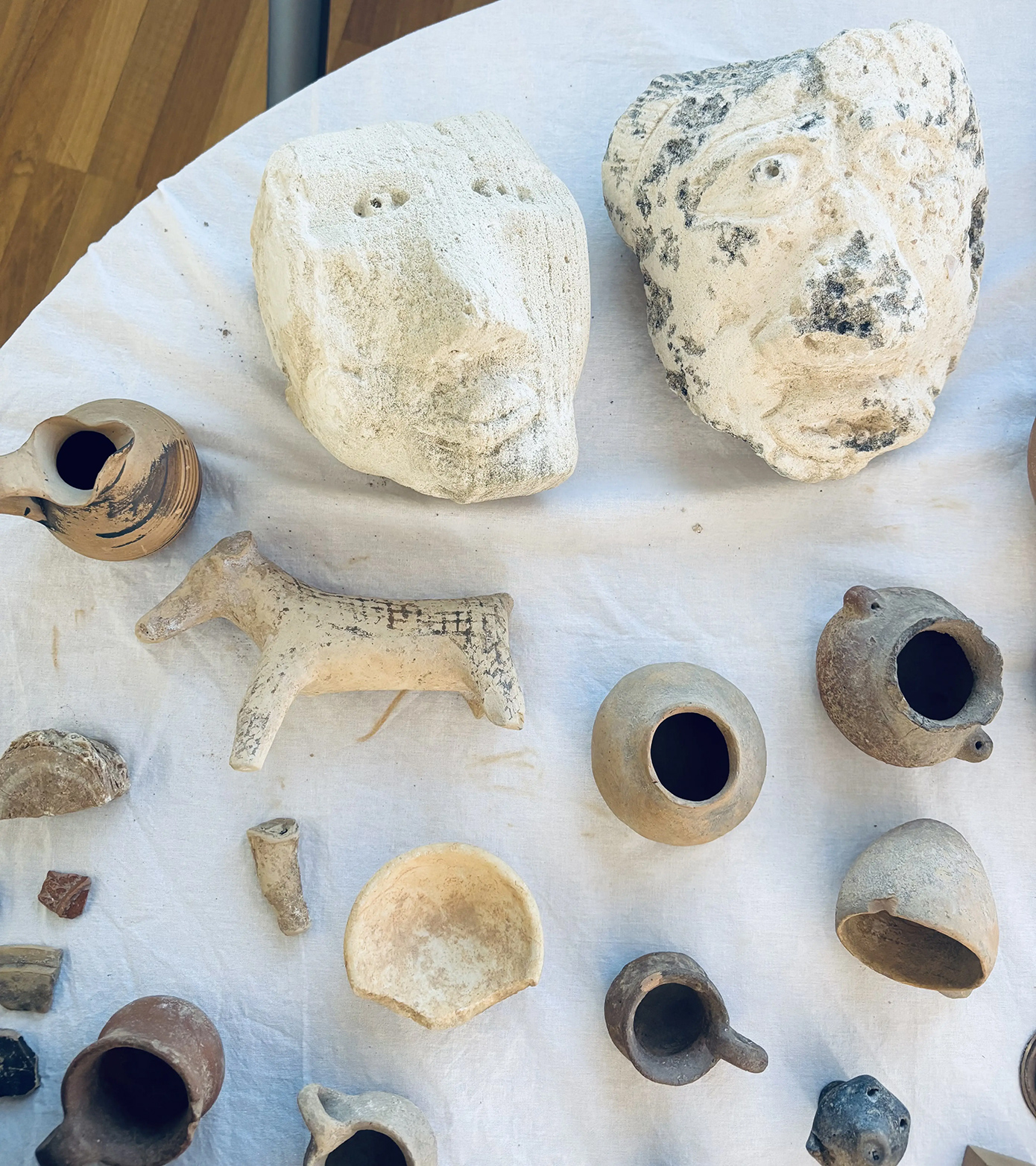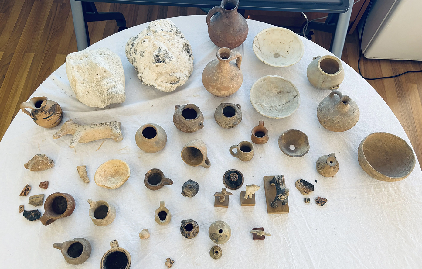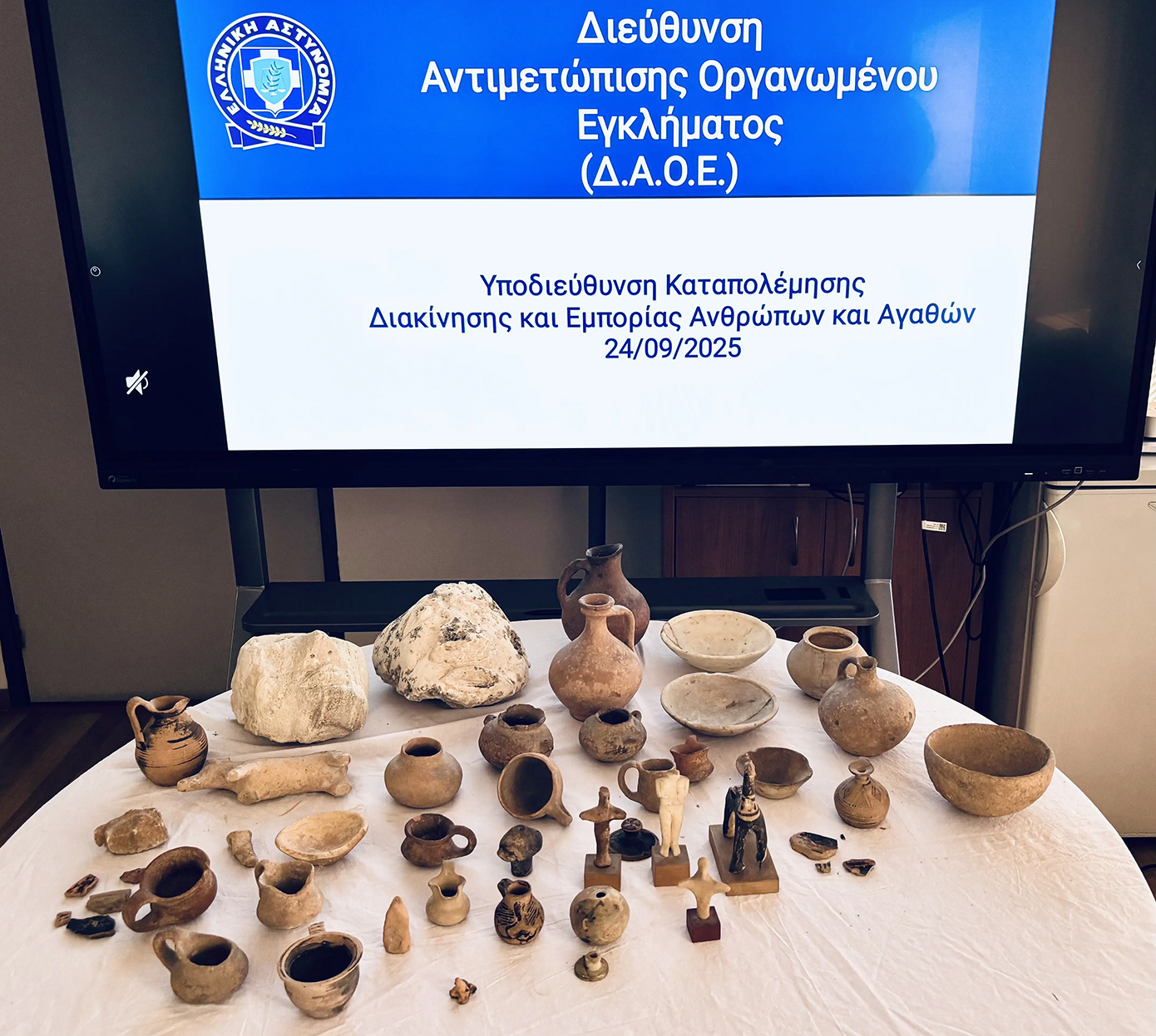 Ειδικότερα, στο πλαίσιο διενεργούμενης προκαταρκτικής εξέτασης, πραγματοποιήθηκε έρευνα στην οικία του κατηγορούμενου, όπου βρέθηκαν και κατασχέθηκαν 39 αρχαία και πιθανώς αρχαία αντικείμενα, όπως μαρμάρινες και πήλινες φιάλες και κεφαλές, πυξίδες, ειδώλια, κύπελλα, αμφορέας, αγγείο, αρύβαλλος, οινοχόη, κυάθια, όστρακα, τμήμα λίθου, καθώς και 1 φιάλη με υγρό και ανθρώπινο έμβρυο.