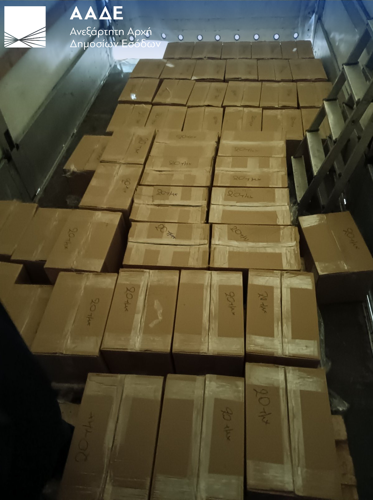Μετά από ενδελεχή έλεγχο, βρέθηκαν σε χαρτοκιβώτια 963 συσκευασίες μείγματος αρωματικού καπνού για ναργιλέ, συνολικού βάρους 963 kg, ο οποίος δεν αναγραφόταν στα παραστατικά.