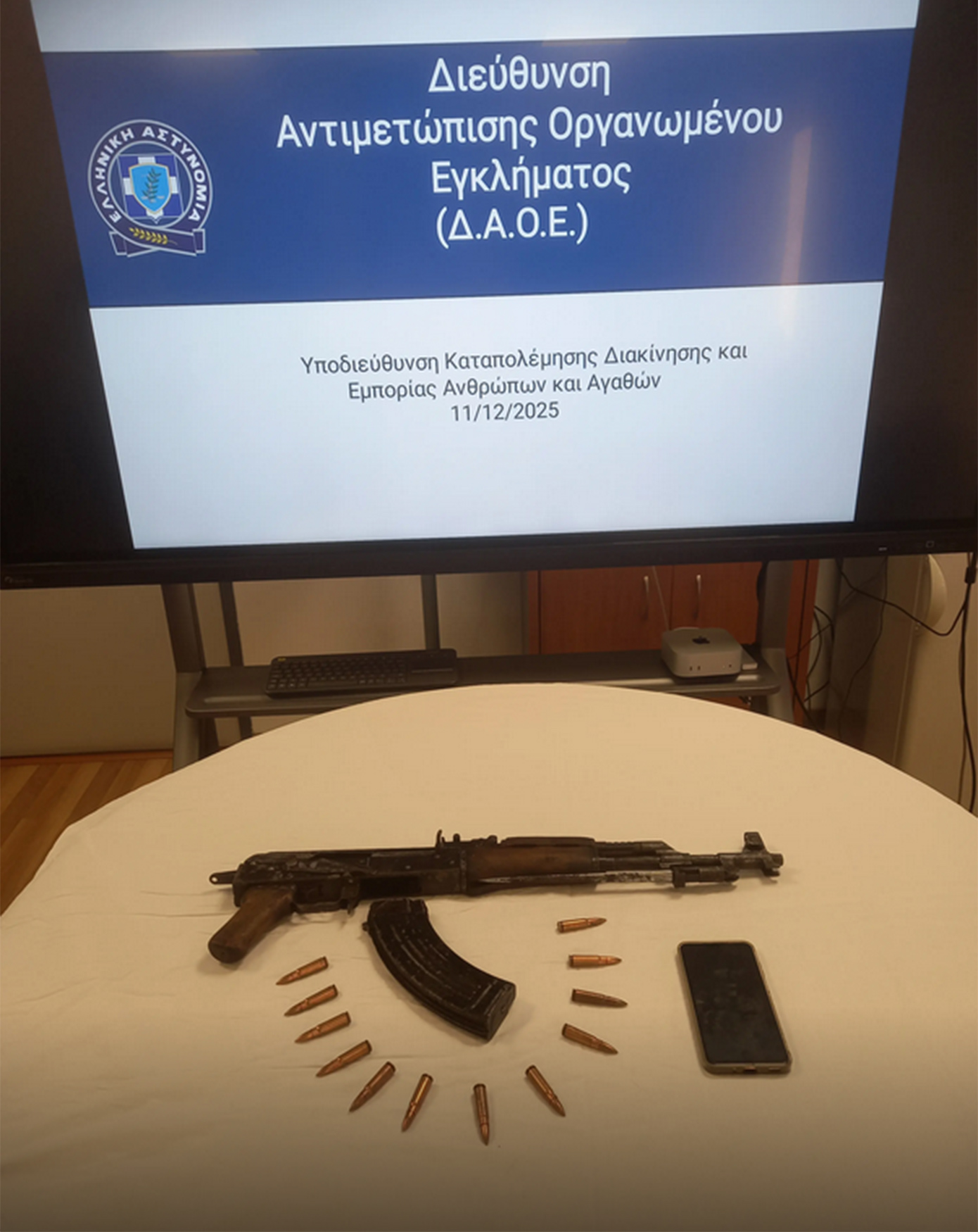 Από την Υποδιεύθυνση Καταπολέμησης Διακίνησης και Εμπορίας Ανθρώπων και Αγαθών της Διεύθυνσης Αντιμετώπισης Οργανωμένου Εγκλήματος συνελήφθη πρώτες πρωινές ώρες χθες, Πέμπτη 11 Δεκεμβρίου 2025, σε περιοχή της Αθήνας, 20χρονος ημεδαπός, ο οποίος κατείχε και μετέφερε πολεμικό τυφέκιο «Kalashnikov».