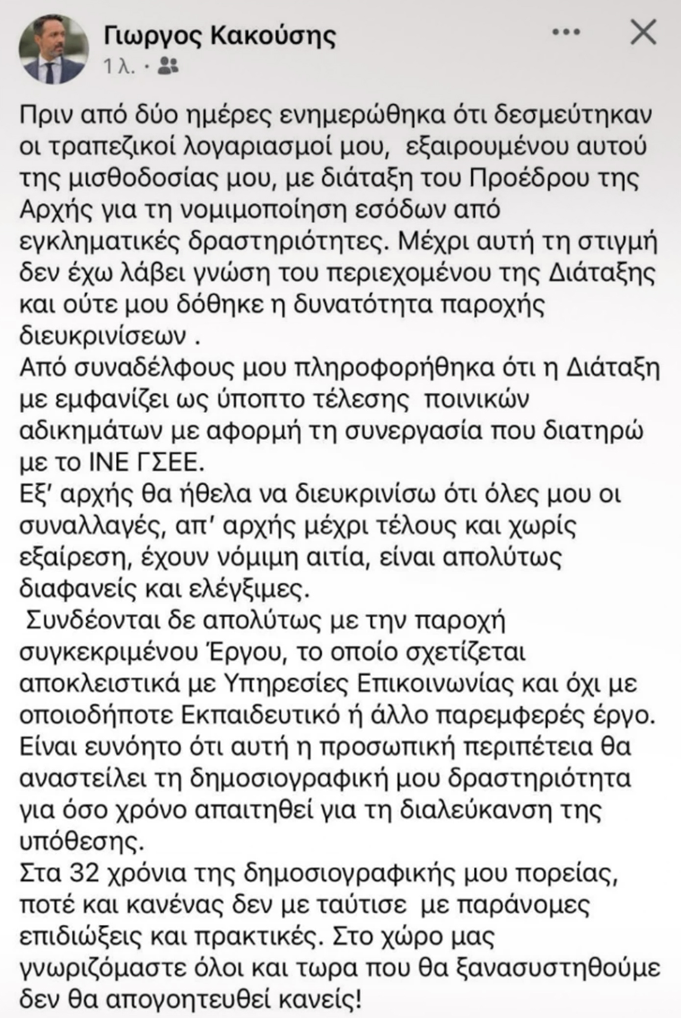 Σε κείμενο που μοιράστηκε στα κοινωνικά δίκτυα, ο Γιώργος Κακούσης υπογραμμίζει την ακεραιότητα με την οποία κινήθηκε καθ’ όλη τη διάρκεια της καριέρας του, δηλώνοντας χαρακτηριστικά: «Στα 32 χρόνια της πορείας μου, ποτέ και κανένας δεν με ταύτισε με παράνομες επιδιώξεις και πρακτικές».