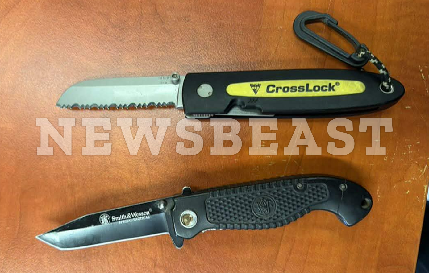 Έπειτα από αστυνομικό έλεγχο βρέθηκαν στην κατοχή του 70χρονου δύο αιχμηρά αντικείμενα μαχαίρια, συνολικού μήκους 20 εκατοστών και μήκος λάμας 9 εκατοστών, τα οποία βρέθηκαν το ένα δίπλα στον οδηγό και συγκεκριμένα στην πόρτα του οδηγού και το δεύτερο στο ντουλαπάκι του συνοδηγού.
