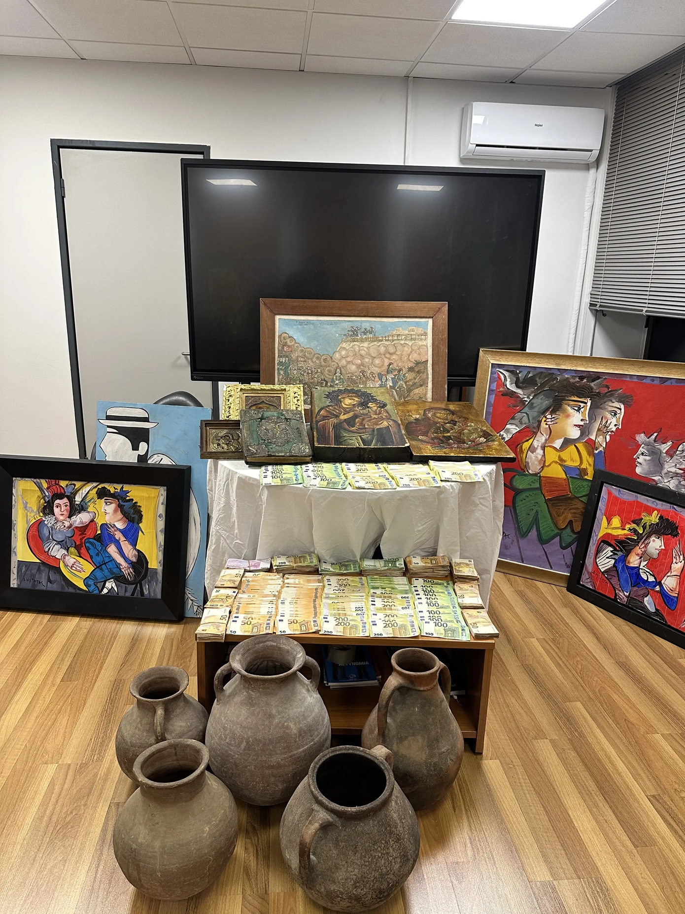 Όπως επισημαίνεται από την ΕΛ.ΑΣ., κατά τη συντονισμένη αστυνομική επιχείρηση της Διεύθυνσης Αντιμετώπισης Οργανωμένου Εγκλήματος, που πραγματοποιήθηκε την Παρασκευή 20 Μαρτίου, κατασχέθηκαν 321 έργα τέχνης, τέσσερις ξύλινες αρχαίες ιερές εικόνες, Ευαγγέλιο, τρεις αρχαίοι αμφορείς, αντικείμενα βυζαντινής περιόδου, μεγάλα χρηματικά ποσά, όπλο, φυσίγγια και ψηφιακά πειστήρια.