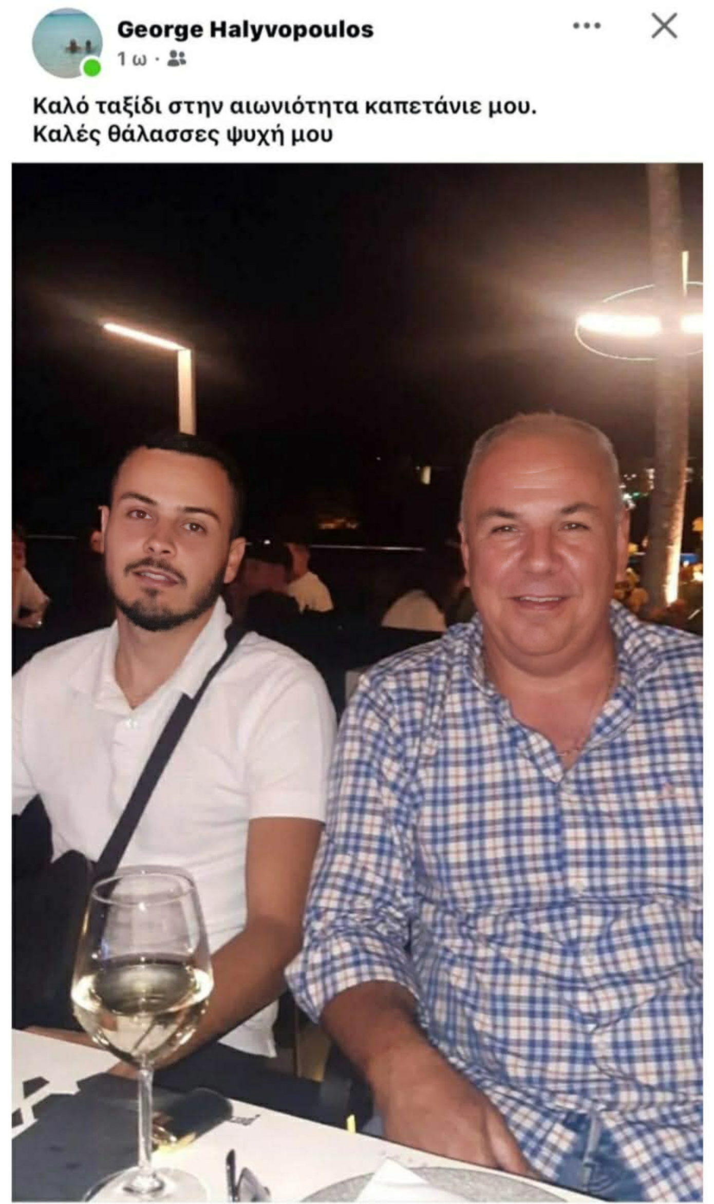 «Καλό ταξίδι στην αιωνιότητα, καπετάνιε μου. Καλές θάλασσες, ψυχή μου», έγραψε στα μέσα κοινωνικής δικτύωσης, ενώ μία κοινή τους φωτογραφία συνοδεύει την ανάρτηση.