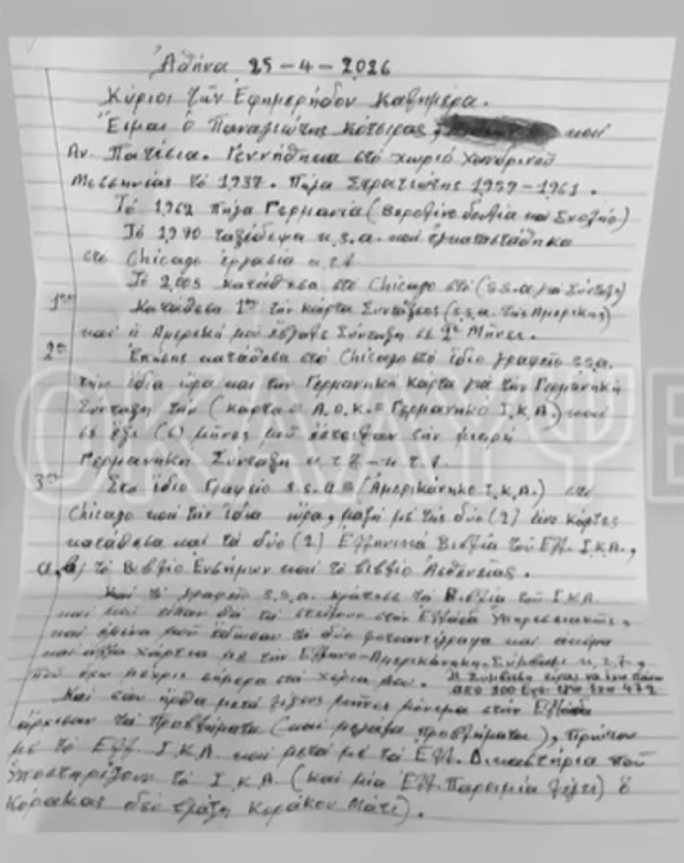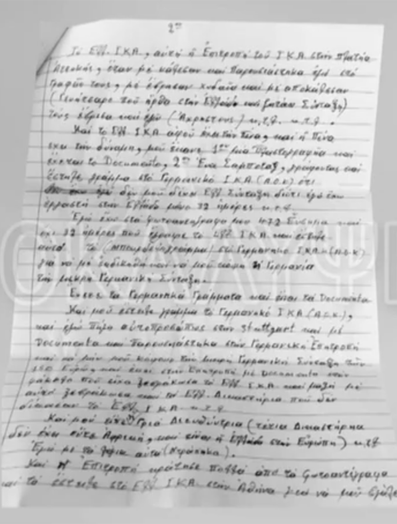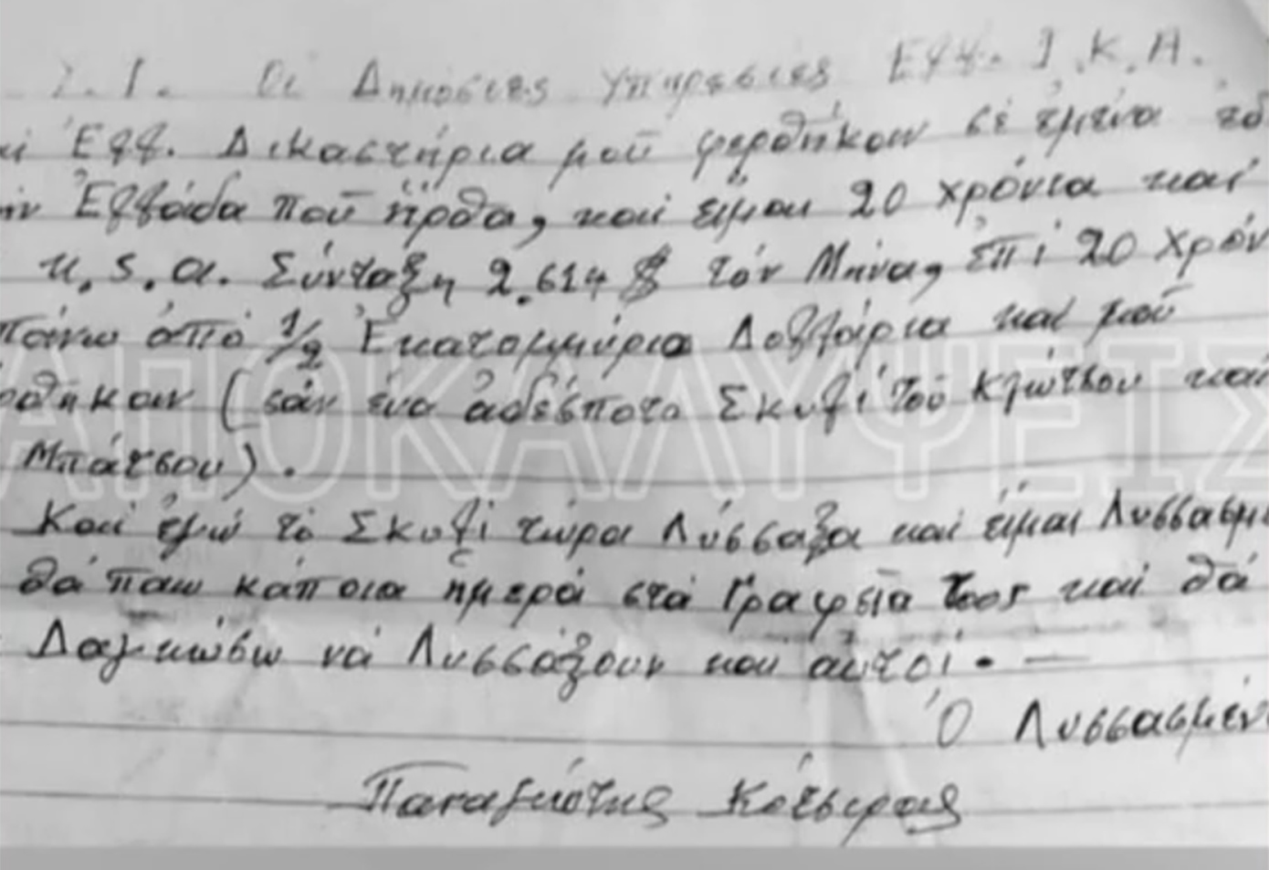 «Στην Ελλάδα που ήρθα και είμαι 20 χρόνια… μου φέρθηκαν σαν ένα αδέσποτο σκυλί, του κλώτσου και του μπάτσου», έγραψε μεταξύ άλλων, σύμφωνα με την εκπομπή «Αποκαλύψεις» που πρόβαλε το χειρόγραφο μανιφέστο.