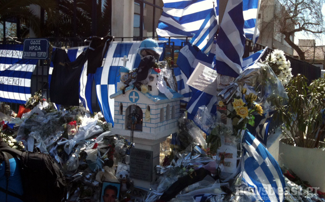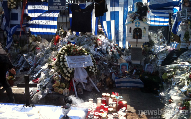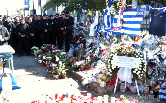 Δεκάδες αστυνομικοί της ομάδας ΔΙ.ΑΣ. δυτικής Αττικής αλλά και συνάδελφοί τους από άλλες Υπηρεσίες καθώς και απλοί πολίτες περνούν από το σημείο που έγινε το μακελειό και αφήνουν ένα λουλούδι στη μνήμη των δύο αστυνομικών.